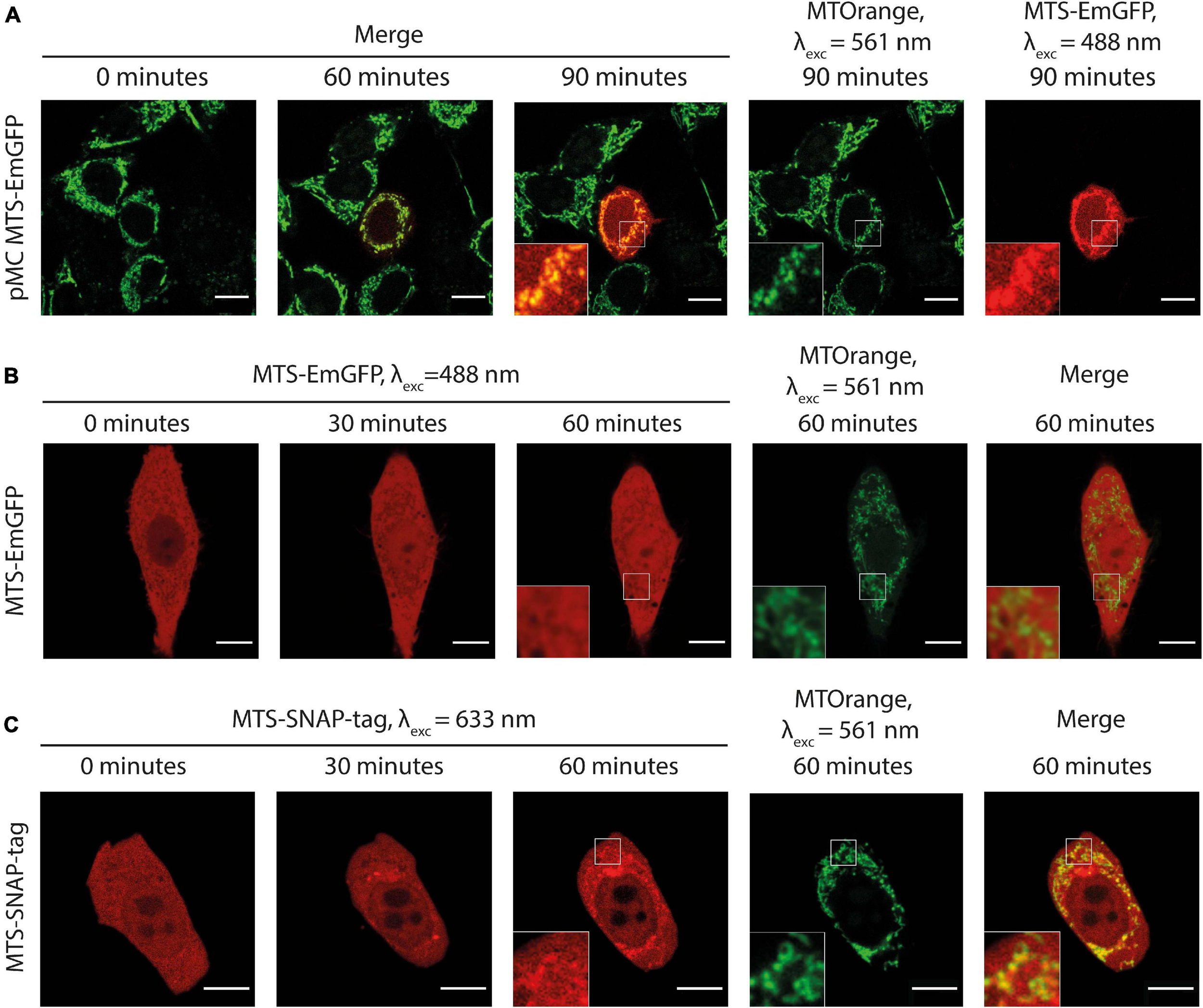 Figure 3. (A) Time-lapse microscopy of MTS-SNAP-tag protein redistribution in HEK293-MTS-Dendra2 cells after the injection. The MTS-SNAP-tag protein fluorescence (red) co-localizes with the mitochondria after 30 min. The mitochondria are labeled by the MTS-Dendra2 protein (green). The bottom row shows a time series of the selected region. The tracking time is given in minutes. (B) Time-lapse microscopy of the SNAP-tag protein redistribution (red) in the HEK293-MTS-Dendra2 cells after the injection, the “shadows” correspond to the mitochondria, as seen in the enlarged inset by comparison with the MTS-Dendra2 labeled mitochondria (green). (C) Time-lapse microscopy of the MTS-SNAP-tag protein redistribution after the injection in the HEK293-MTS-Dendra2 pre-incubated with 50 μM CCCP. The MTS-SNAP-tag protein (red) initially forms a brighter rim around the spherical mitochondria (green), indicated by white arrows in the enlarged insets in the first image (0 min). Scale bars: 10 μm.