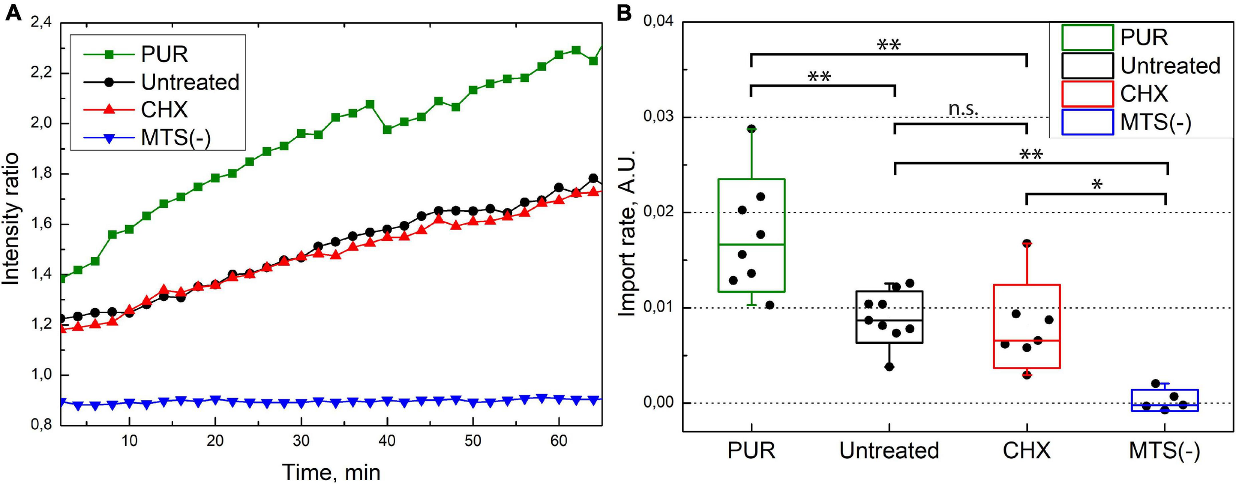 Figure 5. (A) MTS-SNAP-tag protein import into the mitochondria. Each line represents the ratio of average mitochondria fluorescence to cellular fluorescence over time averaged for 6–9 cells under similar conditions. The PUR treated cells (green) show a higher import speed compared to the CHX- and untreated cells (red and black, respectively). The SNAP-tag protein (blue) shows no import into the mitochondria. (B) Import rate under different conditions. The ratio of average fluorescence from mitochondria and whole cell of the MTS-SNAP-tag protein over time is linearly fitted between 5 and 60 min, and the slope coefficients are plotted. The boxes show a standard deviation, the whiskers indicate the range of values. 7/7/9 cells from three separate experiments were used for puromycin/cycloheximide/no treatment, respectively. For the SNAP-tag protein experiment, five cells were used from a single experiment. The significance level is given according to the one-way ANOVA with the post hoc Tukey LSD test: ∗∗p < 0.005, ∗p < 0.05, n.s.–not significant.
