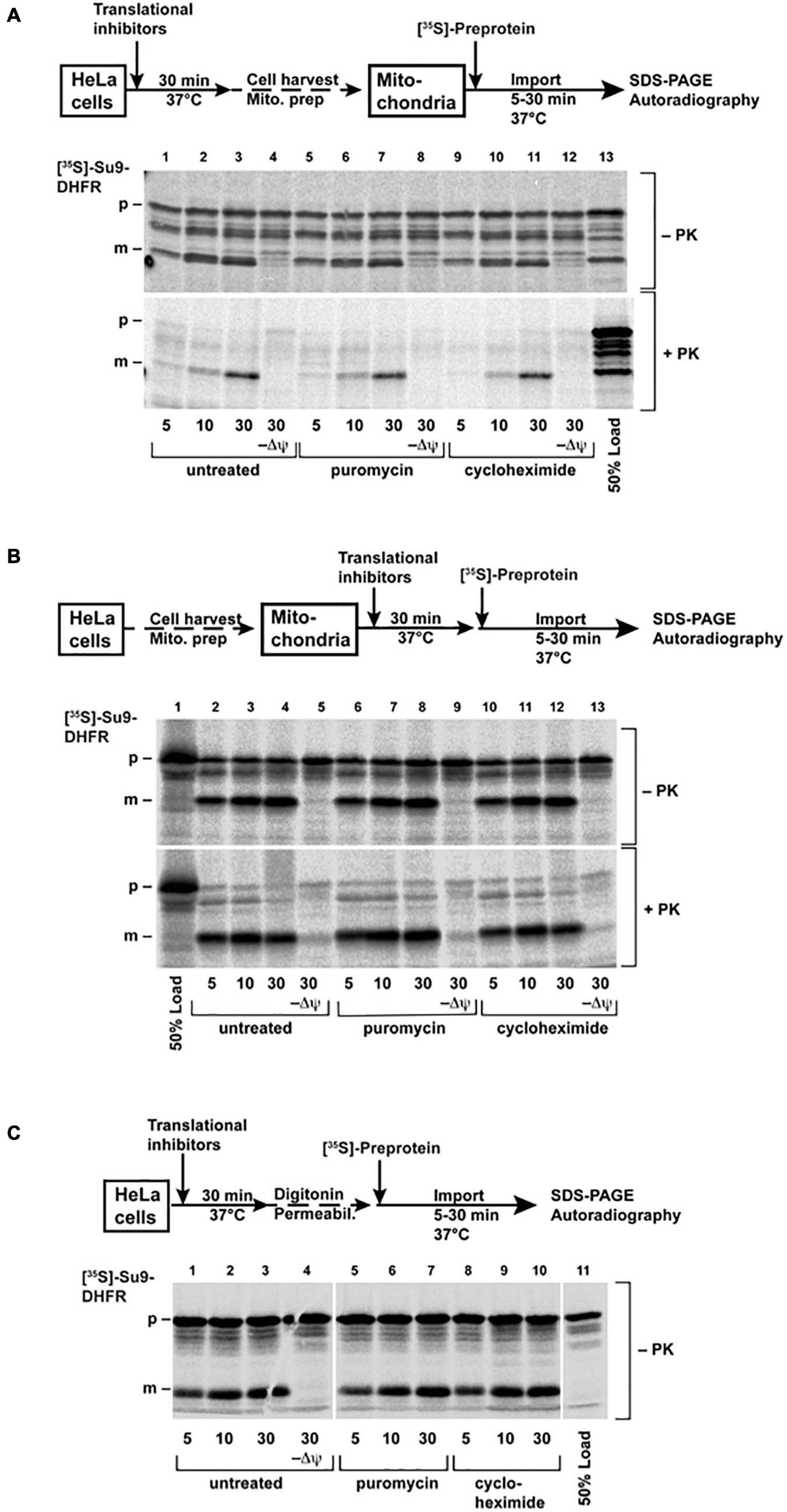 Figure 6. Import of the [35S]-labeled protein Su9-DHFR was performed as described in the “Materials and Methods” section. The cells (A) or the isolated mitochondria (B) were pre-treated before import with PUR (20 μg/ml) or CHX (100 μg/ml) for 30 min at 37°C. The import reactions were incubated for the indicated times. (C) The cells were permeabilized with digitonin after pre-treatment, and then import was performed directly without isolation of the mitochondria. In the control reactions (–Δψ), the inner membrane potential was depleted, as described. After import, the cells were treated with proteinase K, as indicated. The imported proteins were analyzed by SDS-PAGE and autoradiography (p: precursor form, m: mature form of Su9-DHFR). The schematic outlines of the experimental procedures are given.