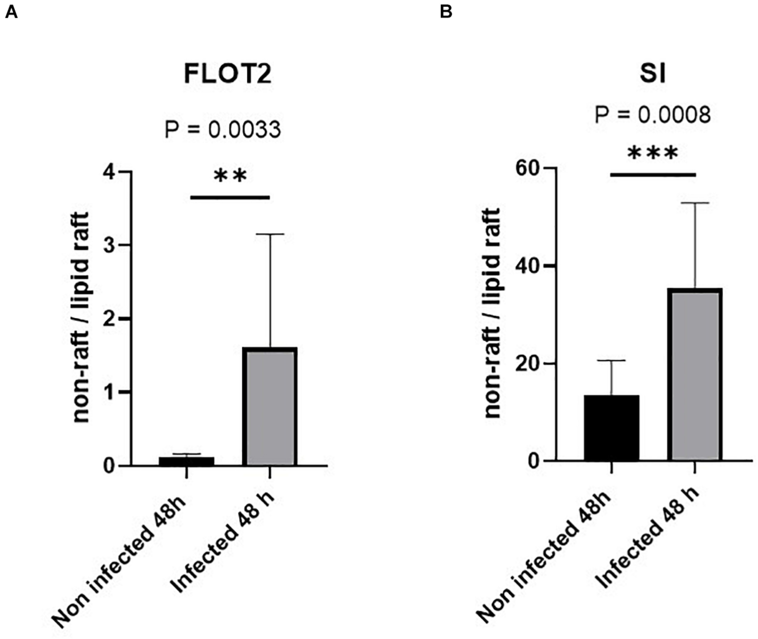 Lipid rafts (LRs) are altered in Caco-2 cells infected with Staphylococcus aureus Newman. Control non-infected or S. aureus infected Caco-2 cells were solubilized with 1% (w/v) Triton X-100 and separated on sucrose density gradients. Ten fractions were collected and used for further analysis in which the LRs are found in the top fractions (fractions 1–3) due to their low buoyant density. The distribution of the LR markers flotillin-2 (FLOT-2) (A) and sucrase–isomaltase (SI) (B) in the bottom three fractions (non-rafts) and in the top three fractions (LRs) in the control non-infected cells was compared with that of respective values from the same fractions in cells infected with S. aureus using by Western blotting. Raw data are shown in Supplementary Figures 5, 6. The redistribution suggests an altered LR composition in S. aureus-infected Caco-2 cells. Statistical significant differences are shown as ** p < 0.01 or ***p < 0.001.