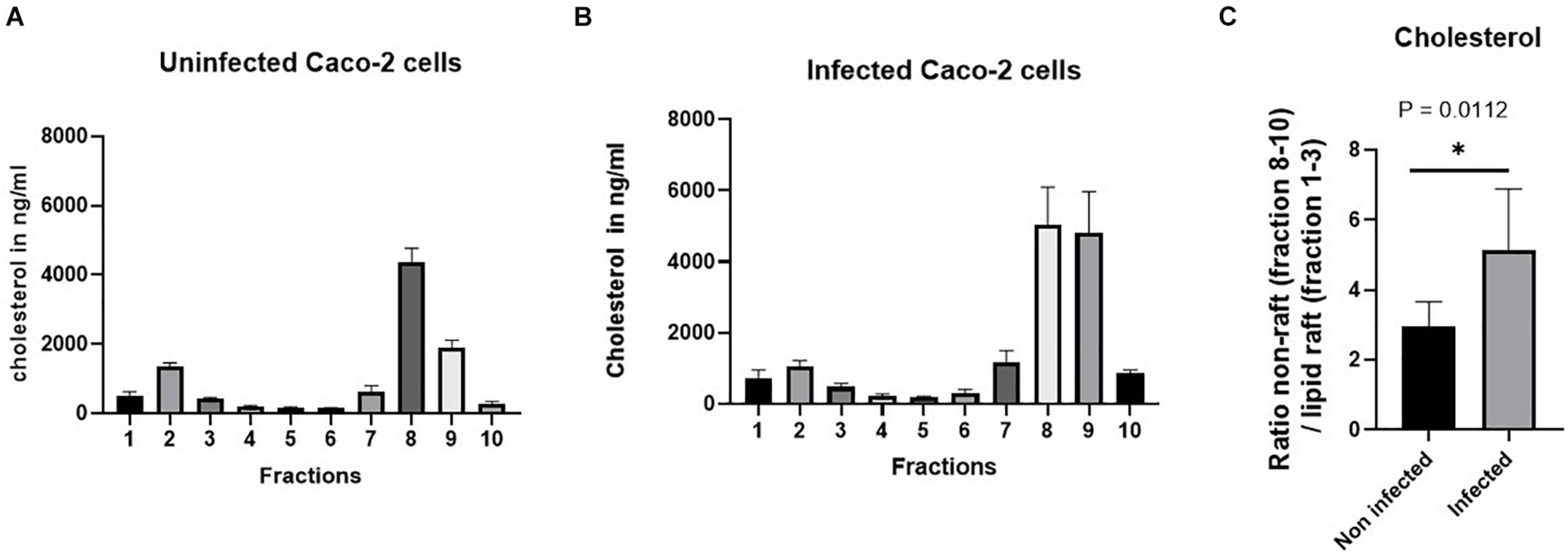 The proportion of cholesterol. For the separation of the lipid rafts (LRs) from the non-LR fractions, sucrose gradient fractionations were used, in which the LRs are found in the top fractions (fractions 1–3) due to their low buoyant density. The level of cholesterol in the bottom three fractions (non-rafts) and in the top three fractions (LRs) in the control non-infected cells was compared with that of cholesterol from the same fractions in cells infected with S. aureus. (A,B) The raw data of the proportion of cholesterol in the control non-infected cells compared with cells infected with S. aureus. Cholesterol analysis was performed by high-performance liquid chromatography (HPLC). (C) A significant reduction (almost 50%) in the cholesterol levels was observed in the LRs of Caco-2 cells infected with S. aureus. The data represent mean ± SEM of two independent experiments with samples in duplicates or triplicates (n = 5). Statistical significant differences are shown as *p < 0.05.