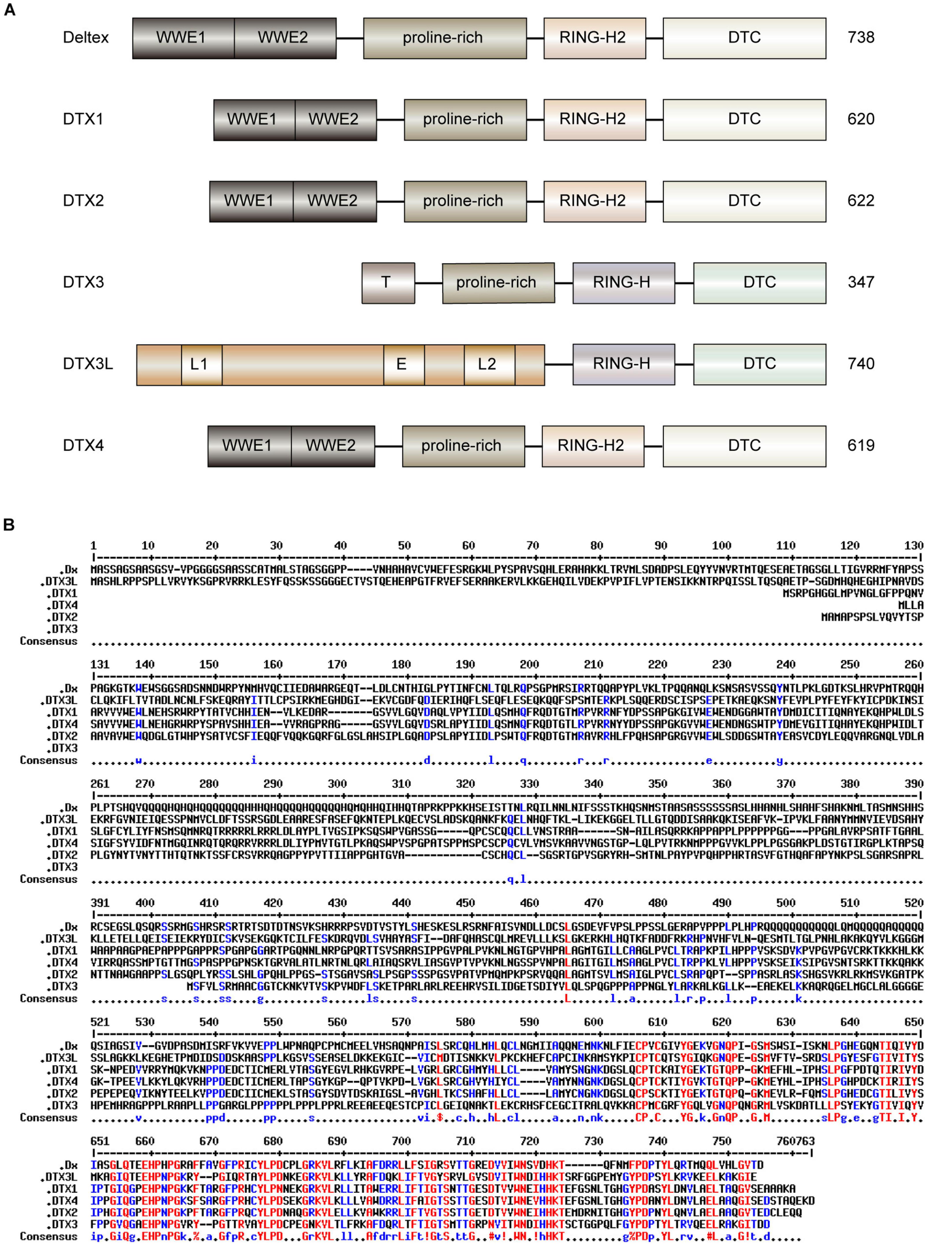 Domain architectures and sequence alignment of human DTX family and Dx protein in Drosophila. (A) The domain architecture of human DTX family and Dx. The functional motifs of human DTX family members are highly analogous to those of Dx in Drosophila. The N-terminal WWE1 and WWE2 domains of Dx, DTX1, DTX2, and DTX4 can bind to the ankyrin repeats of the Notch receptor. DTX3 has a truncated unique N-terminal domain (T) that lacks the ability to bind to ankyrin repeats. The long N-terminal region of DTX3L is associated with nuclear localization signals (L1 and L2) and nuclear export signal (E). The proline-rich regions are similar, except for DTX3L. The Deltex C-terminal (DTC) domains are practically conserved in all DTX proteins. The RING domain of each C-terminal region is divided into classical RING-H2 domain (Dx, DTX1, DTX2, and DTX4) or non-classical RING-H domain (DTX3 and DTX3L). (B) The sequence alignment of human DTX family and Dx. The multiple sequence alignment was performed using hierarchical clustering (Corpet, 1988), and generated via the Multalin program (version 5.4.1) with a high consensus value of 90% and a low consensus value of 50%. The identical residues are shown in red, and similar residues are in blue. Consensus symbol of!: anyone of IV, $: anyone of LM, %: anyone of FY, and #: anyone of NDQEBZ.