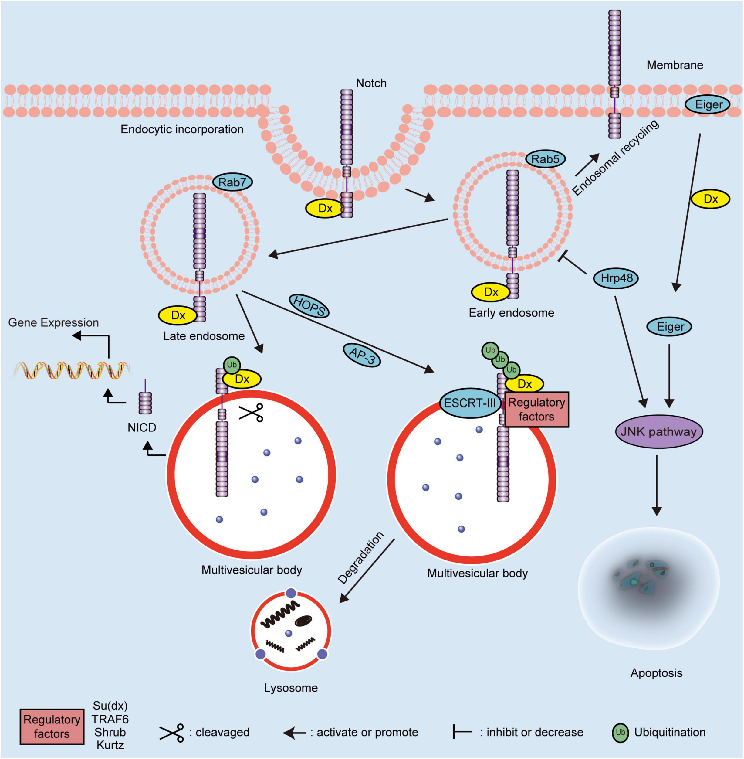 Schematic diagram showing the molecular mechanisms of Dx in Drosophila. The regulation mechanisms of Dx on the Notch signaling pathway depend on the ubiquitination pattern of the Notch receptor. Dx activates the endocytosis of Notch independent on the canonical ligands. The endosomal maturation is initiated by the HOPS complex and converted from Rab5 to Rab7. Interaction with the AP-3 complex promotes Notch targeting to the late-endosomal and lysosomal vesicle membranes. Dx functions as a positive modulator of the Notch signaling pathway when the Notch receptor is monoubiquitinated. The extracellular domain of monoubiquitinated Notch is removed and degraded following cleavage. Then, the NICD of Notch is released to activate the downstream gene expression. However, Dx acts as a negative regulator of the Notch signaling pathway when Notch is polyubiquitinated by Dx and regulatory factors, including Su(dx), TRAF6, Shrub, and Kurtz. The polyubiquitinated Notch is transferred into multivesicular body via ESCRT-III and degraded via the endosome/lysosome pathway. Dx also influences the JNK signaling pathway to induce apoptosis via interacting with Hrp48 or Eiger. NICD, intracellular domain; Dx, Deltex; TRAF6, tumor necrosis factor receptor associated factor 6; AP-3, adaptor protein-3; HOPS, homotypic fusion and vacuole protein sorting; ESCRT-III, endosomal sorting complex required for transport-III; Hrp48, heterogeneous nuclear ribonucleoprotein 48; JNK, Jun N-terminal Kinase; Su(dx), Suppressor of Deltex; Ub, ubiquitin.