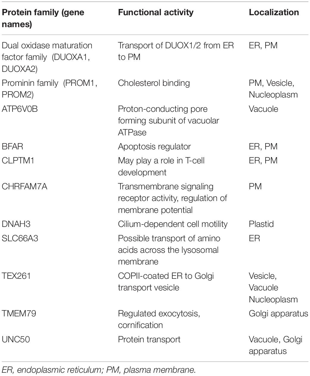 In addition to the tweety, sideroflexin, and YIPF families’ associations with diseases just discussed, six proteins in the dataset had strong associations with diseases using the DisGeNET resource (Piñero et al., 2017; see Supplementary Table 1). Both ARV1 and EBP are associated with intellectual disabilities as well as epilepsy in the former and cataracts in the latter. DAGLA was associated with neurodegenerative disorders while DUOXA2 is associated with thyroid issues, which is discussed below. The sideroflexin family and OXA1L from the mitochondrial inner membrane protein family, which localize to the mitochondria, also have proteins associated with mitochondrial diseases.