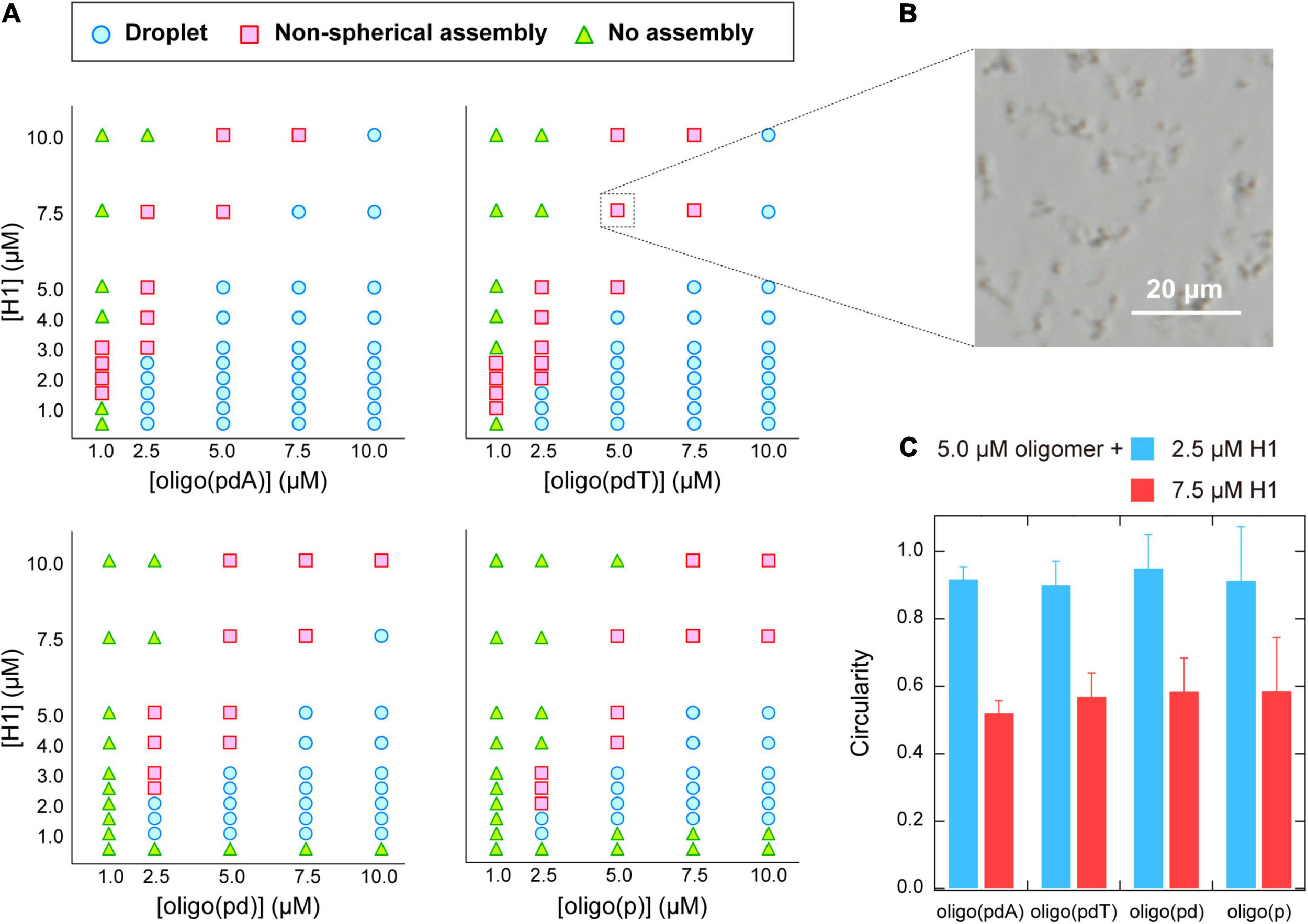 Figure 3. (A) Phase diagrams of aqueous mixtures of oligomers and H1. (B) Phase-contrast microscopy image of typical non-spherical assemblies; 5.0 μM poly(pdT) and 7.5 μM H1; scale bar = 20 μm. (C) Circularity of the assemblies formed in solutions containing 5.0 μM oligomer and 2.5 or 7.5 μM H1. The values were obtained by analyzing the fluorescence microscopy images of the solutions under the indicated conditions using the image processing software image J.