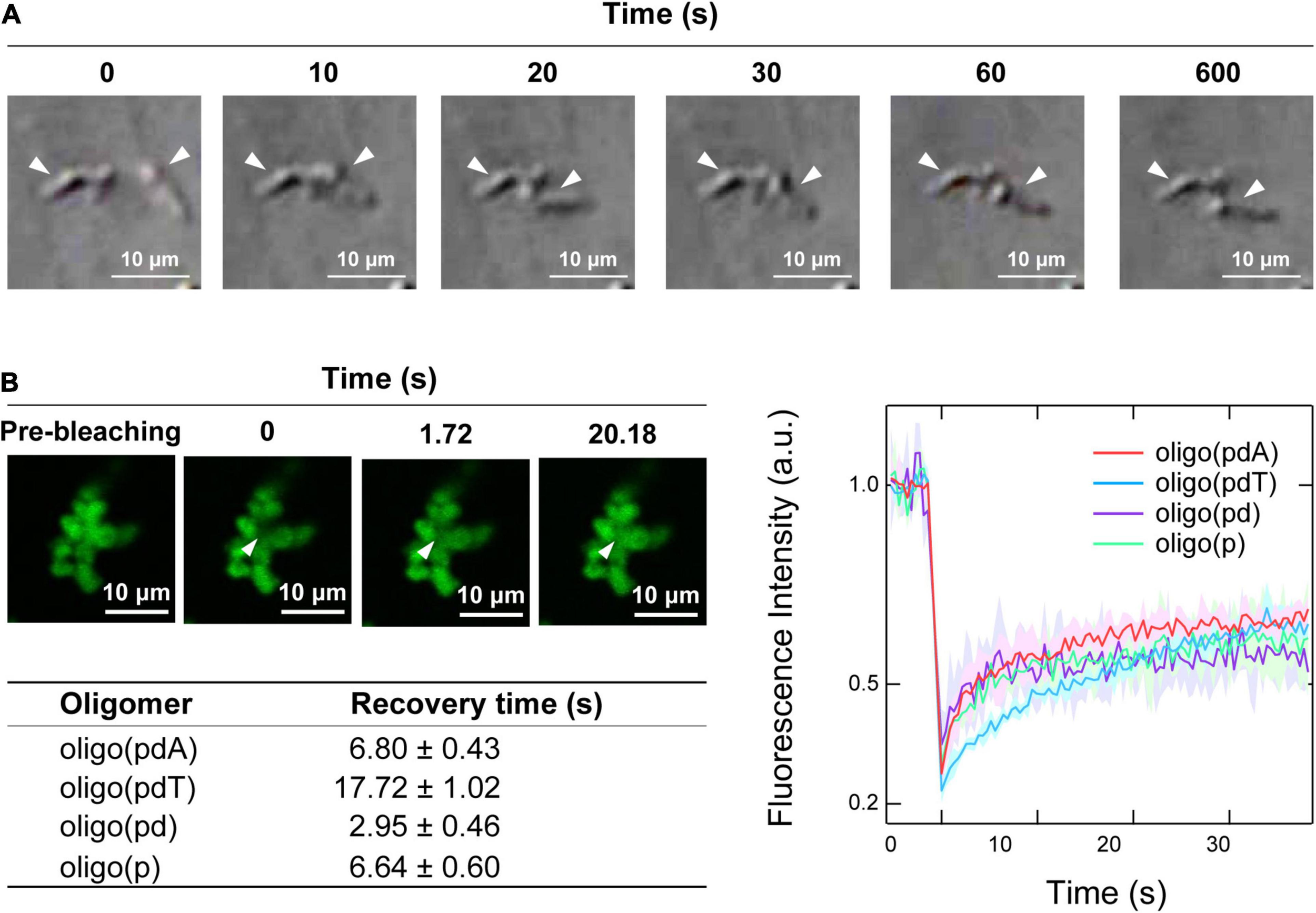 Figure 4. Physical properties of the non-spherical assemblies. (A) Collision process of the non-spherical assemblies formed by oligo(pdA) (5.0 μM) and H1 (7.5 μM); scale bar = 10 μm. (B) Left: confocal fluorescence microscopy images during the FRAP measurements. White arrowheads indicate the bleached areas; scale bar = 10 μm. Right: FRAP recovery curves for the oligomers; values shown represent mean values ± standard deviation (n = 3). The table below lists the fluorescence-recovery times calculated by single-exponential fitting.