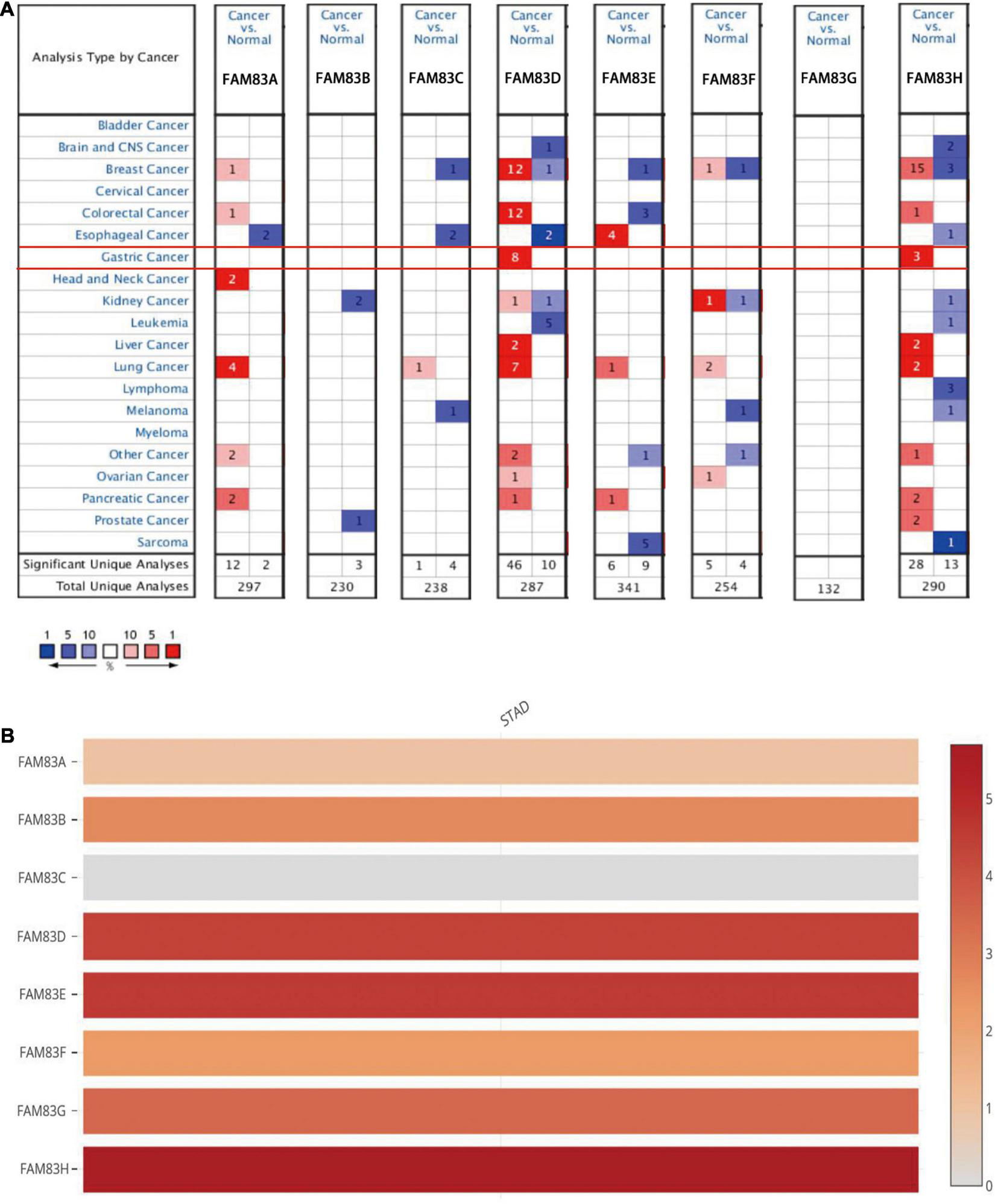 The mRNA expression level of FAM83 family in STAD and other distinct types of cancer (ONCOMINE and GEPIA database). (A) This figure shows the number of datasets with statistically significant mRNA up-regulation (red) or down-regulation (blue) in the FAM83 family. The student’s t-test was used to compare different transcriptions. The cut-off values of p-value and fold change were as follows: p-value: 0.05, fold change: 2, gene rank: 10%, data type: mRNA. (B) Relative level of FAM83 family members in STAD. FAM83H was the highest mRNA expression in STAD.