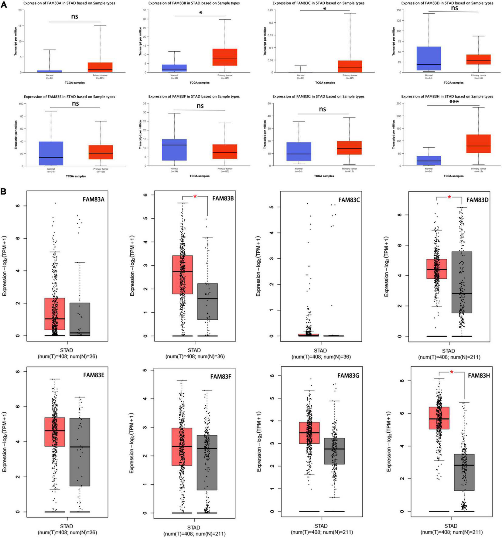 (A) The mRNA expressions of FAM83B/C/H were found to be over-expressed in STAD tissues compared to normal samples in UALCAN. ∗∗∗p < 0.001 and ∗p < 0.05. (B) The mRNA expressions of FAM83B/D/H were discovered to be over-expressed in STAD tissues compared to normal stomach tissues in GEPIA2.0. Significance of difference estimated by Student’s t-test and analysis of variance (ANOVA). ∗p < 0.01.