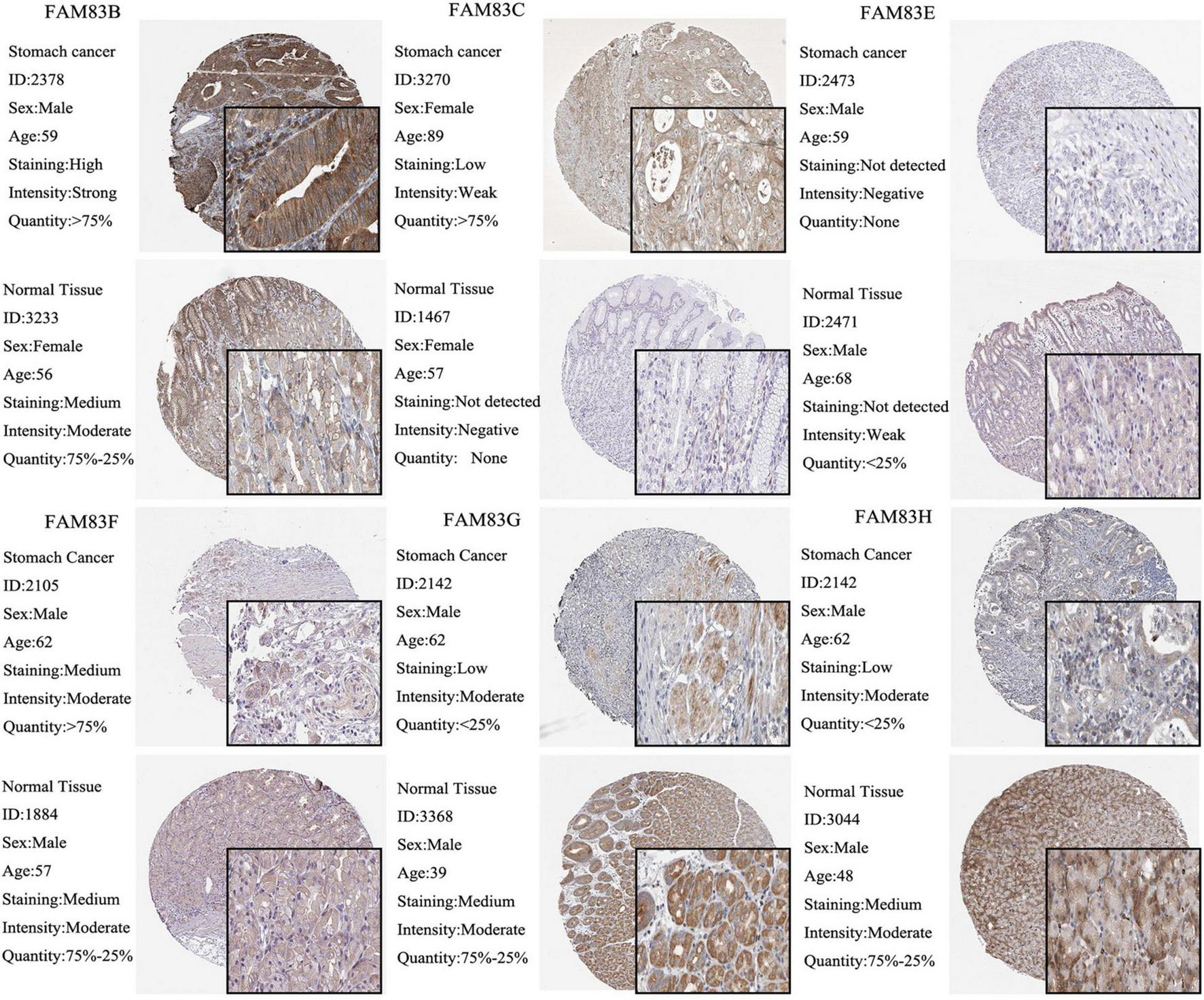 The IHC analysis of FAM83 family with prognostic values. Differentially expressed proteins of FAM83 family members with prognostic values in STAD and normal stomach tissues in The Human Protein Atlas database.