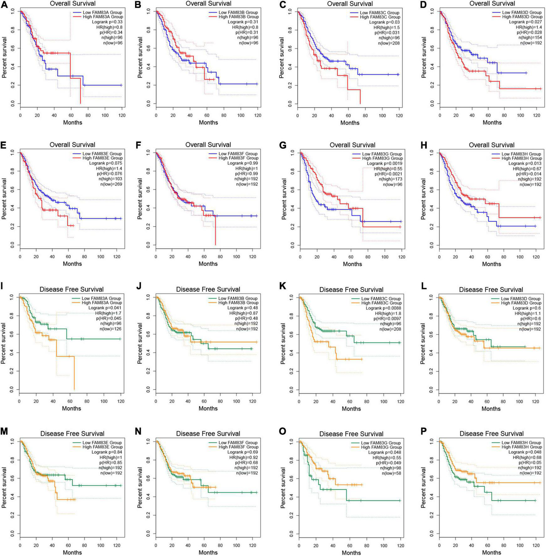 (A–P) The prognostic value of FAM83 family members in STAD patients in the overall survival (OS) and disease free survival (DFS) curve (GEPIA2.0).