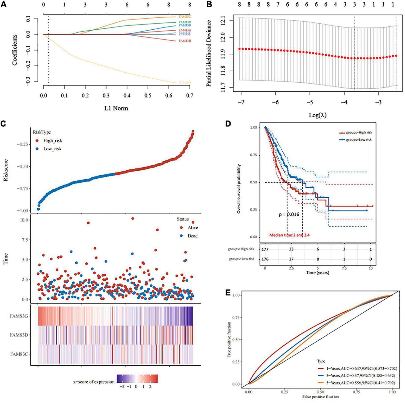 The construction of prognostic model of gene signature from FAM83 family in STAD (TCGA)by LASSO analysis. (A) Coefficients of selected features are shown by lambda parameter. (B) Partial likelihood deviance vs. log (λ) was drawn using LASSO Cox regression model. (C) The relationship between survival status—risk score rank and expression of FAM83 family. (D) Kaplan–Meier survival plots of the two groups (high risk and low risk). (E) ROC curves of the survival model in STAD.