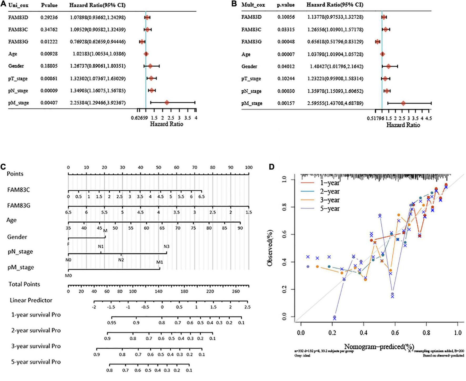 Univariate and multivariate Cox regression analyses and establishment and verification of Nomogram for the FAM83 family genes and clinical risk factors of STAD patients. (A,B) Forest plots for hazard ratios (HRs) of survival-associated FAM83 family genes and clinical risk factors in STAD. (C) Nomogram to predict the 1-, 2-, 3-, and 5-year overall survival of STAD patients. (D) Calibration curve for the overall survival nomogram model in the discovery group. A dashed diagonal line represents the ideal nomogram, and the brown line, blue line, orange line and purple line represent the 1-, 2-, 3-, and 5-year observed nomograms, respectively.