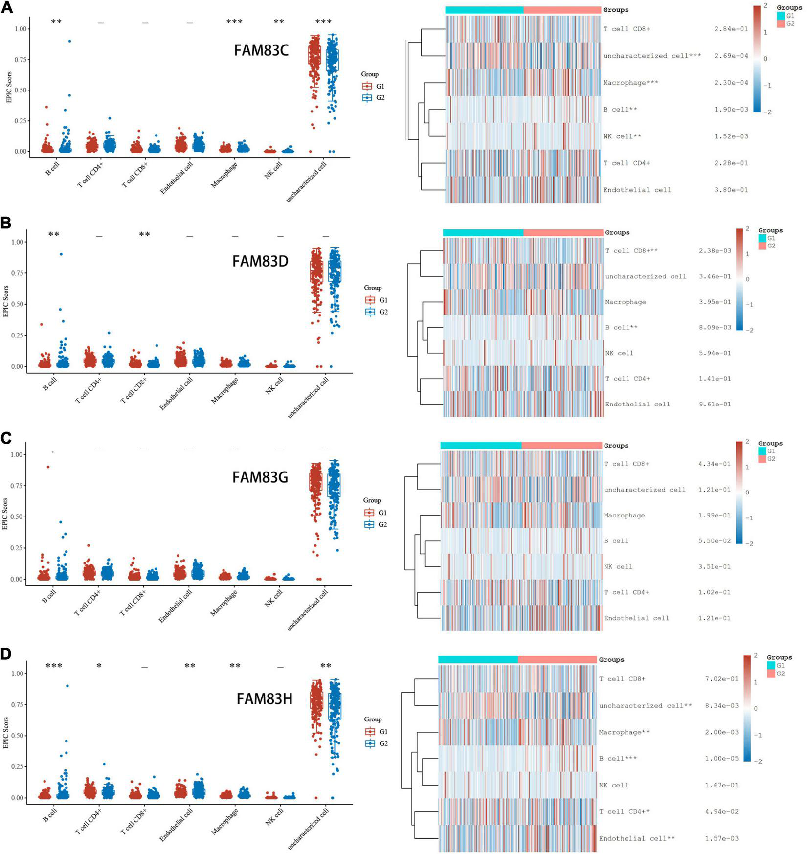 In order to comprehensively explore the relationship between FAM83 family members and immune cells, we performed an immune cell infiltration analysis based on the TIMER database and Immunedeconv R package. As a result, there was a negative correlation between FAM83C expression and the infiltration of B cells (Cor = –0.136, p = 8.02e-3), CD8+ T cells (Cor = –0.217, p = 2.05e-5), and myeloid dendritic cells (DCs) (Cor = –0.161, p = 1.69e-3). FAM83D expression was negatively associated with the infiltration of B cells (Cor = –0.209, p = 4.26e-6) and positively associated with the infiltration of macrophages (Cor = 0.23, p = 6.34e-6). Then, FAM83G expression was negatively associated with the infiltration of macrophages (Cor = –0.122, p = 1.77e-2) and positively associated with the infiltration of DCs (Cor = 0.112, p = 2.94e-2). In addition, there was a negative correlation between FAM83H expression and the infiltration of CD4+ cells (Cor = –0.118, p = 2.18e-2), CD8+ T cells (Cor = –0.141, p = 6.07e-3), macrophages (Cor =–0.277, p = 4.26e-8), and DCs (Cor = –0.152, p = 2.97e-3) (Figures 11, 12).