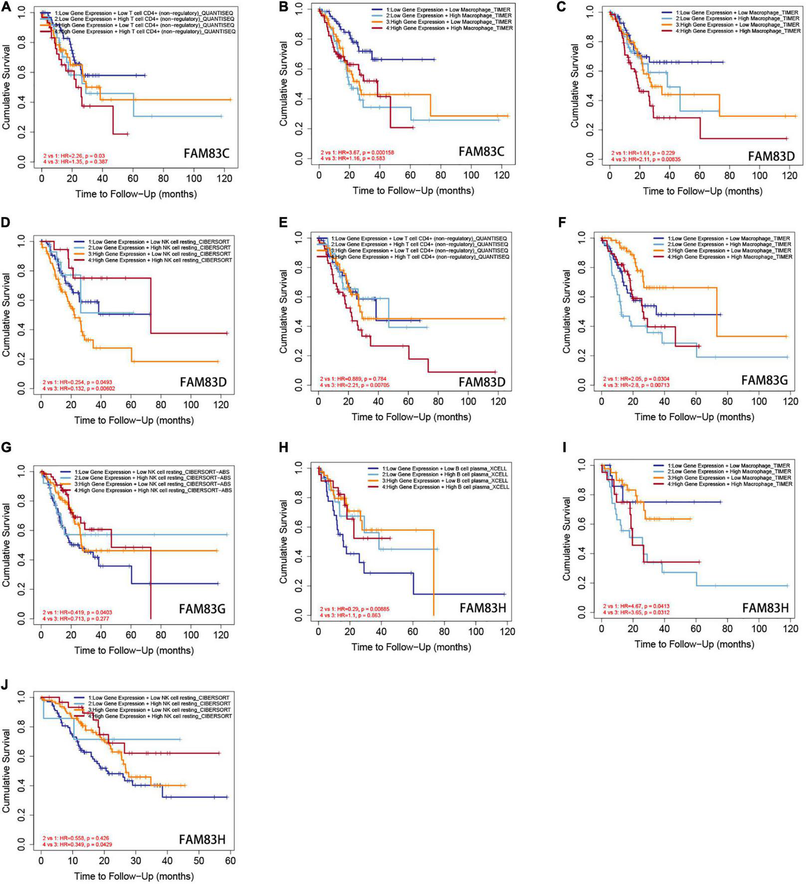 Conclusion: These findings suggested that FAM83C/D/G/H might play key roles in STAD tumorigenesis and progression, and FAM83C/D might be risk factors but FAM83G/H might be favorable prognostic factors for STAD patients. In addition, CD4+T cells and Macrophage cells may be the promoters of FAM83D in progression of STAD, while NK cells may promote the protective effect of FAM83H on STAD patients.