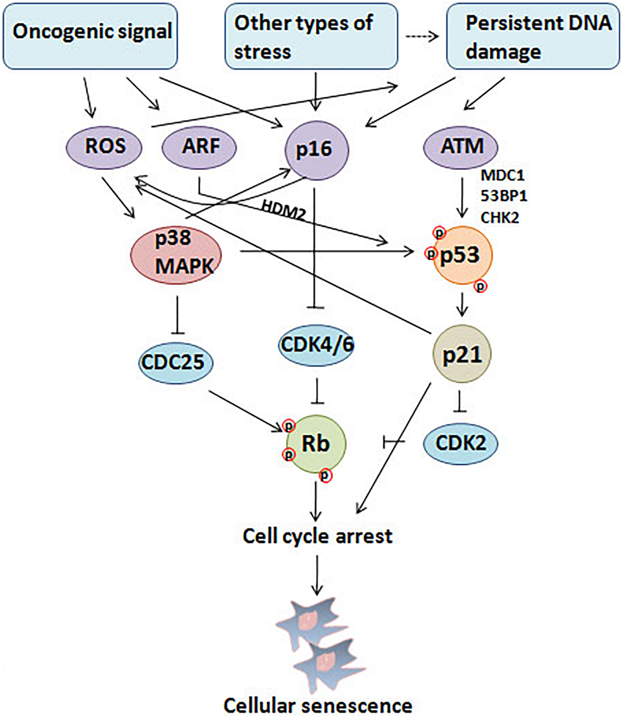 Cellular senescence is considered to be a stress response triggered by multiple mechanisms, such as DNA damage, telomere shortening, oncogene activation, tumor suppressor loss, centrosome dysfunction, and epigenomic damage (Ben-Porath and Weinberg, 2005; Rodier et al., 2011; Schleich et al., 2020; Wu et al., 2020a). These mechanisms are increasingly well-understood at the molecular level. The main effect pathways and triggers of senescence are shown in the Figures 1, 2.