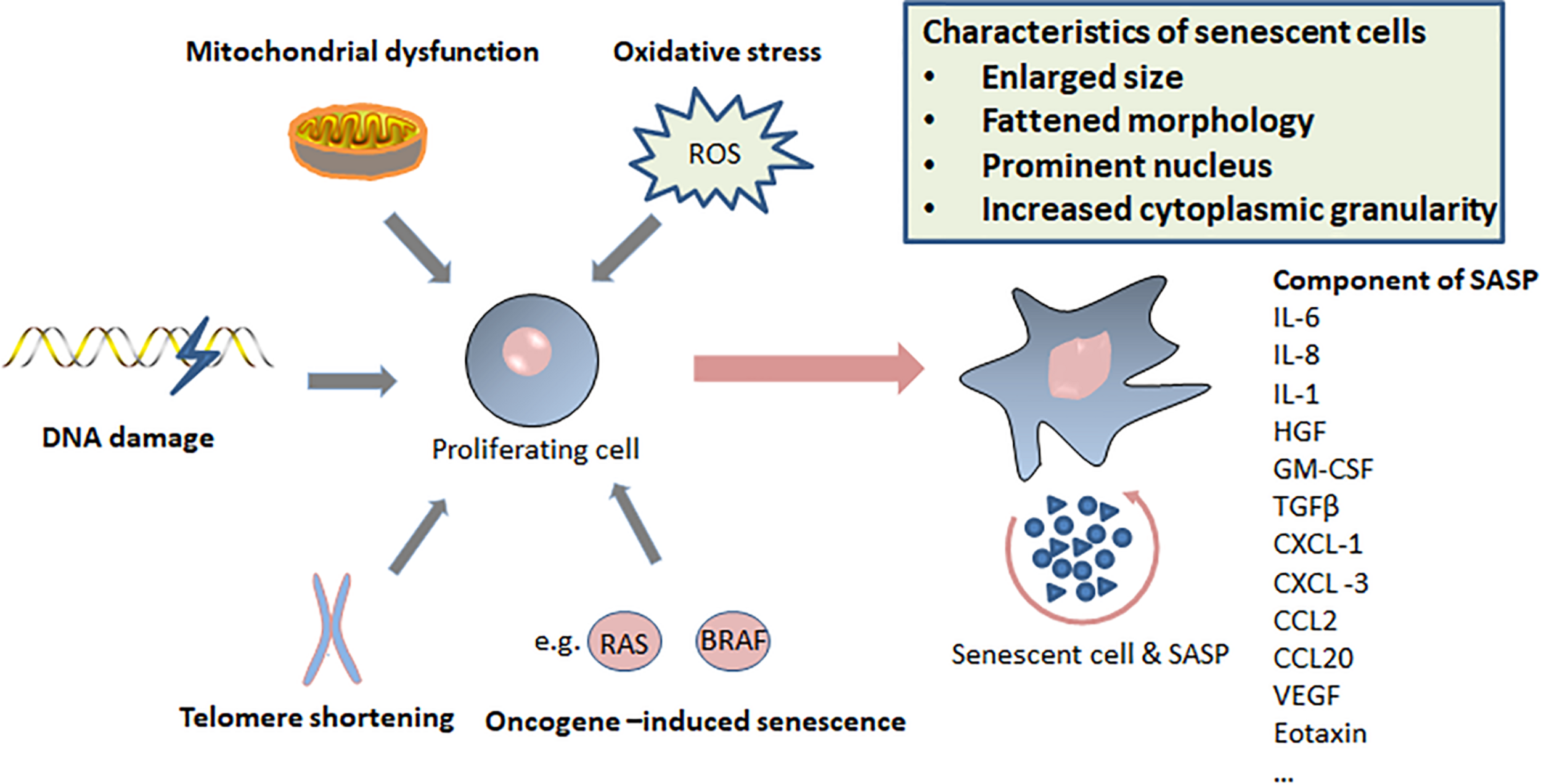 Triggers of senescence, characteristics of senescent cells, and components of senescence-induced secretory phenotype (SASP).