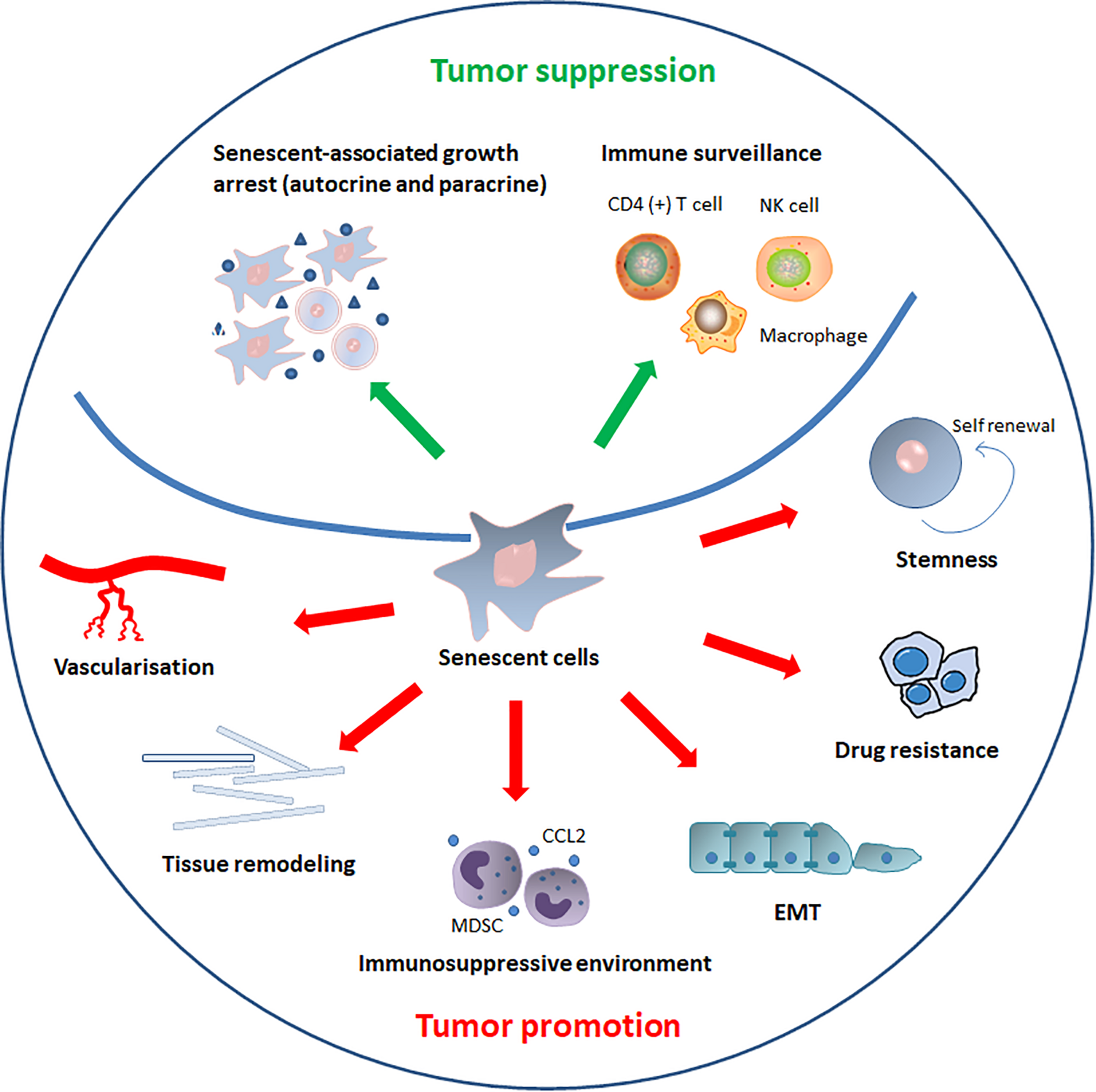 Cellular senescence provides a significant benefit to the host by inducing irreversible cell cycle arrest and eliciting potent immune-mediated incipient tumor cell clearance, which is characterized by reduced incidence of cancer and halted tumor development. Senescence provides an alternative strategy to overcome the limitations of traditional cancer treatment because low dose of drugs can achieve the purpose of inducing senescence. However, senescent cells and SASP components can directly or indirectly promote tumor cells growth, invasion and metastasis, and tumor vascularization. The senescence phenotype is complicated, and the production rate and clearance rate of senescent cell may be the influencing factors of the effects of senescence on tumor progression. One of the possibilities is that senescent cells are only beneficial when they are transient, and the accumulation of senescent cells and SASP cause increased susceptibility to tumorigenesis.