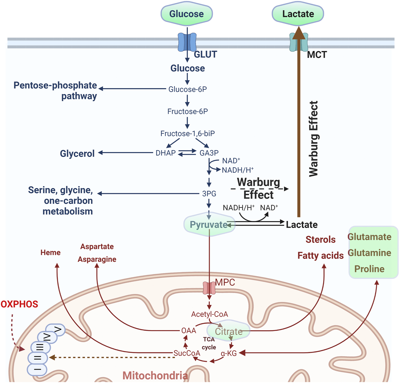 Pyruvate plays a crucial role for cellular metabolism, as it is imported in mitochondria and converted to acetyl-CoA to fuel the Krebs cycle, is used in transamination reactions, while also serving as a ROS scavenger, and in particular for H2O2 (Gray et al., 2014; Liu et al., 2018). Lactate is produced from pyruvate through the action of lactate dehydrogenase and is mostly released in the extracellular space. Systemically, the metabolite traffics through the bloodstream, reaches the liver and is converted back to glucose in a process known as gluconeogenesis. Conversion of pyruvate to lactate occurs at high rates when oxygen availability is limited (anaerobic conditions). It may however follow this route under normal oxygen conditions in a process called “aerobic glycolysis” or Warburg effect (Figure 1), named after the Nobel laurate Otto Warburg who described this phenomenon as a fingerprint of tumor physiology (Warburg, 1956). Although demonized because of its elevated levels in cancer, aerobic glycolysis also takes place in normal cells and tissues under conditions where a high proliferation rate is required, as it is also used to provide the cell with metabolic intermediates (Hume and Weidemann, 1979; Lunt and Vander Heiden, 2011; Liberti and Locasale, 2016; Prochownik and Wang, 2021).