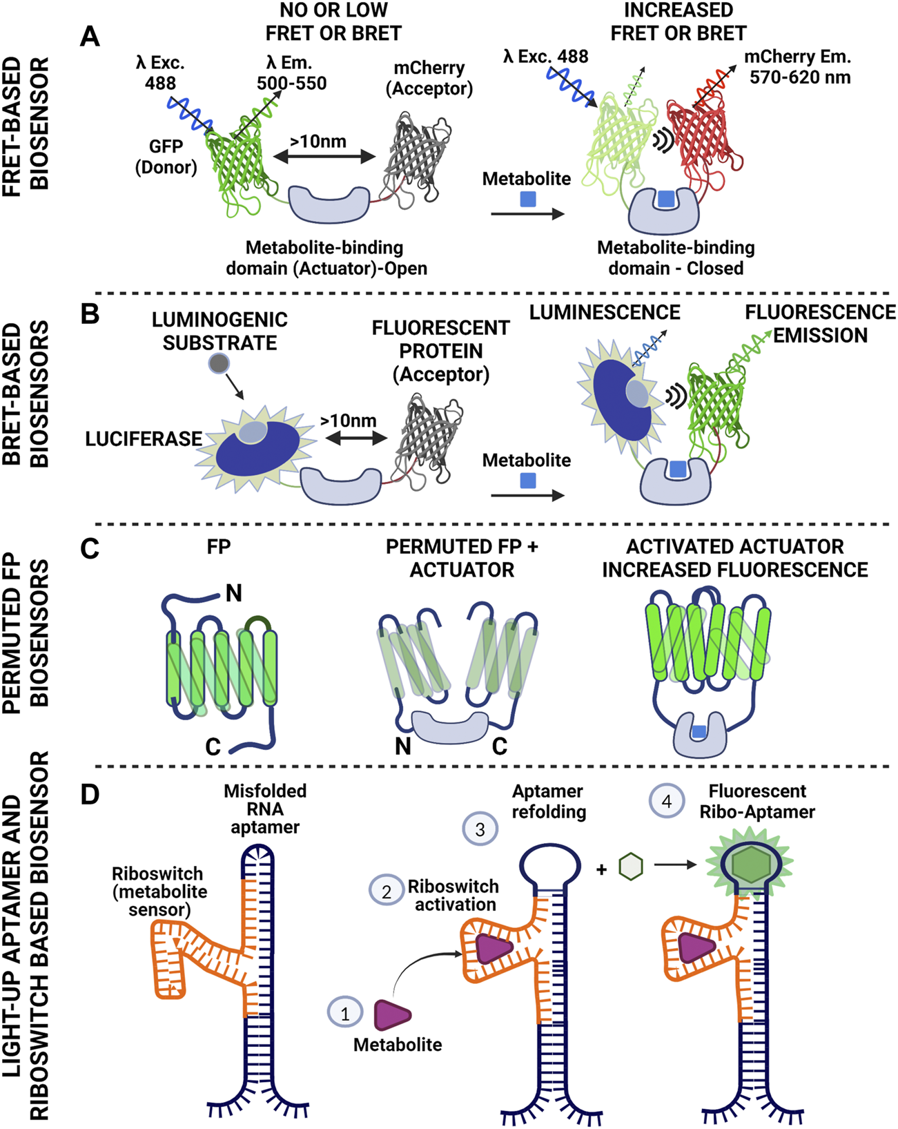 Schematics of basic tools used to construct biosensors for metabolite monitoring. (A) Cameleon-like Förster Resonance Energy Transfer design using fluorescent donor and acceptor with overlapping spectra. The fluorescent molecules are bridged with a protein domain that serves as specific metabolite sensor. Binding of the metabolite to the actual sensor (Actuator) triggers conformational changes that result in reduced distance between the two fluorescent proteins. Proximity facilitates energy transfer to the acceptor resulting in its excitation and subsequent photon emission. Of note, there is no direct photon transfer between the two molecules (non-radiative). This scheme gives positive read out signal (increased FRET). Reciprocally, the actuator might cause the fluorescent proteins to come in proximity in the absence of the metabolite and loosen its conformation upon metabolite binding. In this case the readout will be negative (reduced FRET). (B). Bioluminescence Resonance Energy Transfer is an approach similar to FRET. The energy donor here is luciferase. There is no excitation light for the donor. In the presence of oxygen the enzyme catalyzes oxidation of luciferin (or other suitable substrate) and the reaction emits photons. The wavelength of this emission falls within the excitation spectrum of the acceptor. In a manner similar to FRET, energy is transferred to the acceptor causing the molecule to fluoresce. This scheme allows control of the timing of the recording, as luciferase will produce light when the substrate is supplied. At the same time though the readout will fade with time due to substrate consumption. (C) Single color biosensors, based on permutation of fluorescent proteins. One can shuffle fragments of a fluorescent protein (notice the rearrangement of the C- and N- termini of the protein after permutation) and introduce an actuator within the FP sequence compromising fluorescence. Metabolite binding by the actuator increases proximity of the FP domains thus increasing fluorescence intensity (D) RNA-based strategy for metabolite detection. The scheme includes a type of RNA (aptamer) that binds a fluorogenic substrate and becomes fluorescent (light-up aptamer). This feature though depends on the conformation of the aptamer. Inserting a fragment of RNA in the aptamer sequence that can identify a metabolite (riboswitch) can cause suboptimal folding of the aptamer and loss of fluorescence. Metabolite binding to the riboswitch causes refolding of the aptamer, which thus gains the ability to fluoresce upon substrate binding. The system has been used with success for imaging S-Adenosylmethionine in bacteria and lately in mammalian systems. (Figure prepared using biorender.com).