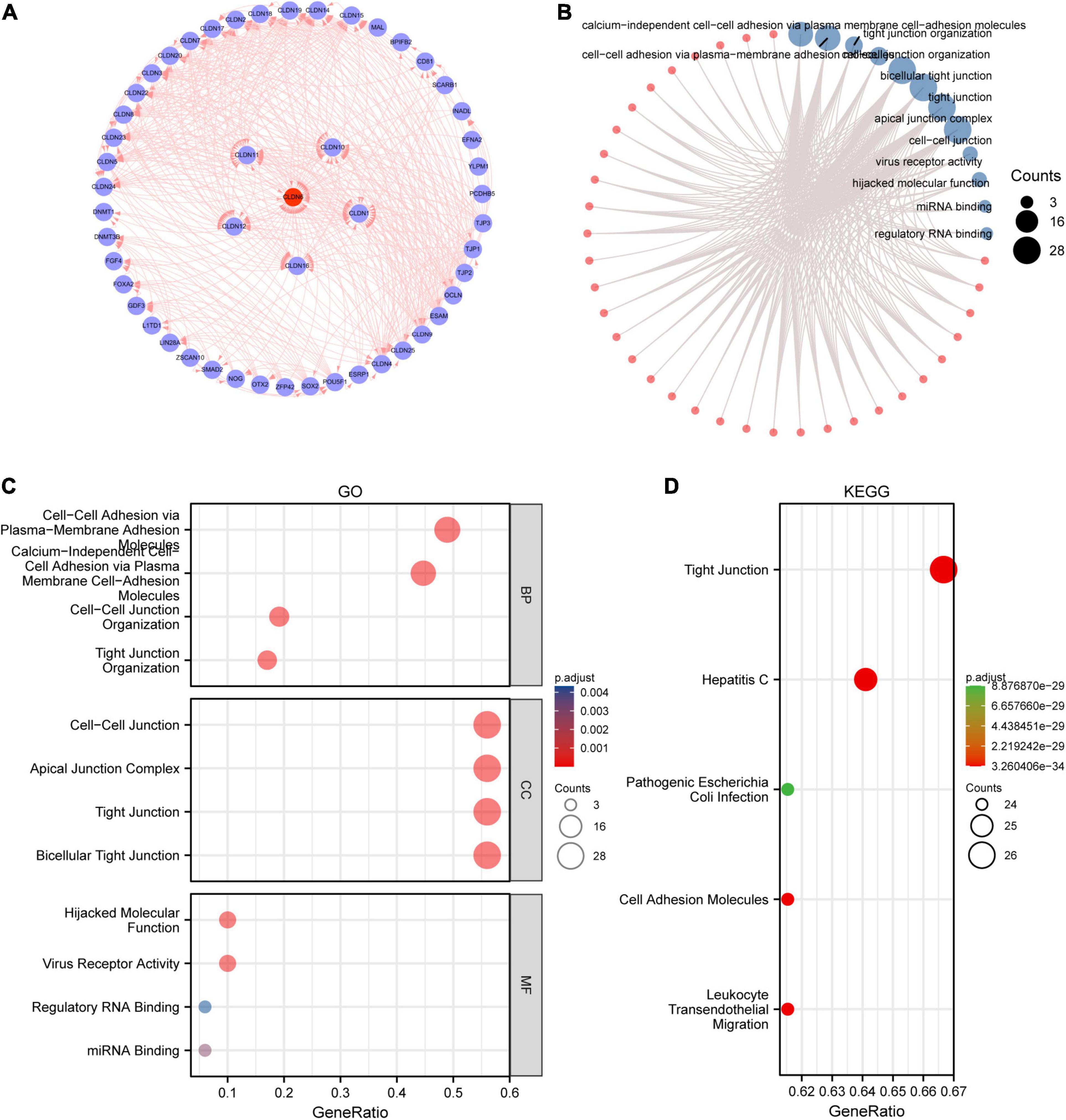 Figure 4. Protein–protein interaction (PPI) network, GO analysis, and KEGG analysis of 50 targeted binding proteins of CLDN6. (A) PPI network; (B) visual network of GO and KEGG analyses; (C) GO analysis; (D) KEGG analysis.
