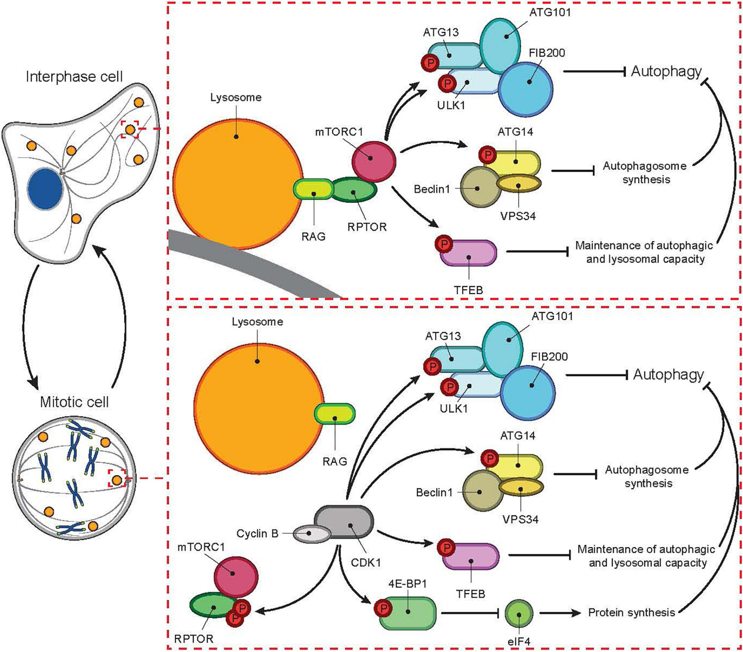 Cell cycle-dependent switch of autophagic master regulator. In interphase, autophagy is tightly controlled by mTORC1. In the absence of nutrients mTORC1 is inactive while autophagy is active. During nutrient-rich conditions, mTORC1 localizes to the lysosomal membrane and gets activated through an interaction between RPTOR and RAG proteins. Activated mTORC1 then inhibits autophagy at several levels, for example by phosphorylating ATG13, ULK1, ATG14, TFEB, and 4E-BPI. In mitosis, mTORC1 activity is inhibited even in the presence of nutrients by CDK1-mediated phosphorylation of RPTOR. In parallel, CDK1 overtakes mTORC1’s role as the inhibitor of autophagy by phosphorylating autophagic mTORC1 substrates listed above.