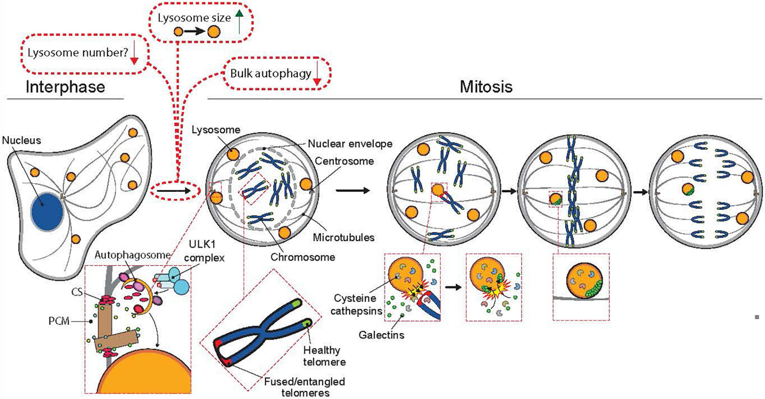 The involvement of lysosomes and autophagy in mitosis. Mitotic cells have reduced autophagic activity and fewer but larger lysosomes than interphase cells. Upon entry to mitosis, bulk autophagy is shut down by CDK1 (see Figure 1 for additional information). In prophase, doryphagy, a type of selective autophagy targeting the centriolar satellites (CS), maintains centrosome integrity, which ensures the formation of a bibolar spindle. The breakdown of the nuclear envelope marks the onset of prometaphase, where the chromosomes can interact with the kinetochore-microtubules of the mitotic spindle. In prometaphase, a few lysosomes are recruited to the proximity of chromosomes with unresolved telomere fusions or entanglements, where their limiting membrane is transiently permeabilized resulting in the release of lysosomal cathepsins into the chromatin and entrance of galectins (marker proteins for lysosomal membrane permeabilization) into the lysosomes. Cathepsin B-mediated cleavage of histone H3 assists the segregation of the fused or entangled chromosomes in anaphase thereby preventing chromosome segregation errors, micronuclei formation and chromosomal instability.