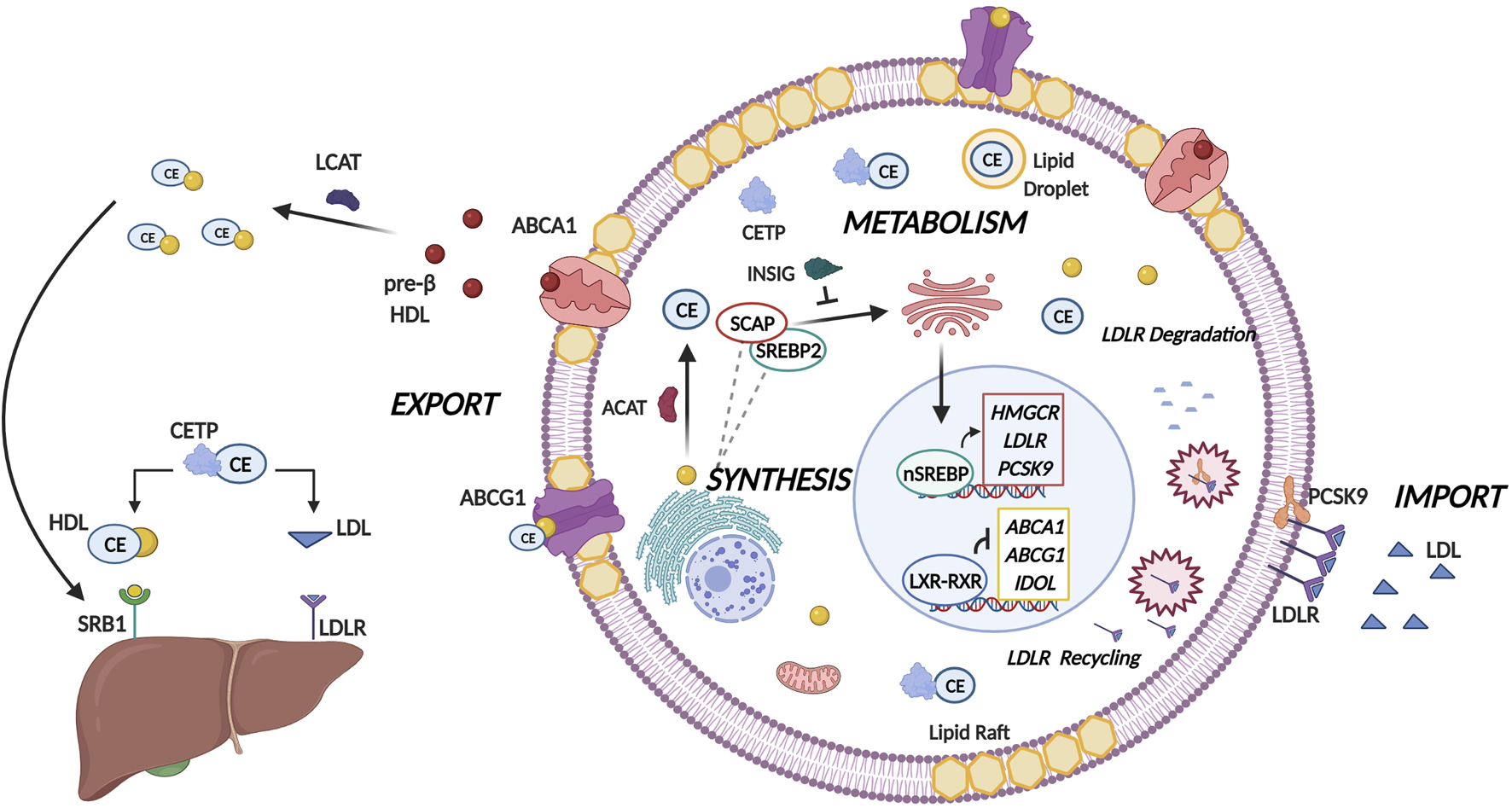 Molecular Mechanisms of Cholesterol Homeostasis. Cholesterol homeostasis is maintained by balancing the levels of cholesterol import, synthesis, metabolism, and export. A pivotal group of transcription factors termed the sterol regulatory element binding proteins (SREBPs) regulate lipogenesis and lipid uptake. When intracellular sterol concentrations are low, cholesterol biosynthesis is induced by SREBP2 where following proteolytic cleavage the nuclear isoform of SREBP2 (nSREBP2) binds to sterol response elements to facilitate expression of lipogenesis target genes namely HMGCR, low density lipoprotein receptor (LDLR) and proprotein convertase subtilisin/kexin type-9 (PCSK-9). HMGCR catalyzes the rate limiting step in cholesterol biosynthesis, whereas the LDLR imports cholesterol from the cellular milieu through endocytosis and hydrolysis of low density lipoprotein (LDL) particles. Collectively, this will lead to increased sterol levels within the cell. PCSK-9 regulates LDLR by either degrading LDLR by recruiting it to lysosome, or by prohibiting the endocytic recycling of LDLR by binding to the epidermal like growth factor repeat of LDLR. To prevent the excess accumulation of cholesterol in the cell, acyl-CoA cholesterol acyltransferase ACAT converts free cholesterol to cholesteryl esters (CEs) which are subsequently transported by cholesteryl ester transfer protein (CETP) from the site of synthesis to sites of storage in lipid droplets. Excess cellular cholesterol and cholesterol-derived oxysterols promotes the Liver-X-Receptor (LXR)-Retinoid-X-Receptor (RXR) mediated transcription of the two principal transporters ATP-binding cassette subfamily A member 1 (ABCA1) and subfamily C member 1 (ABCG1). These transporters transfer cholesterol to pre-β high density lipoprotein (HDL) and HDL respectively where cholesterol can either be eliminated by HDL binding to scavenger receptor- B1 (SR-B1). Alternatively, CETP can mediate the shuttling of cholesterol from HDL to LDL which will then result in elimination of cholesterol by binding to LDLR on the liver.