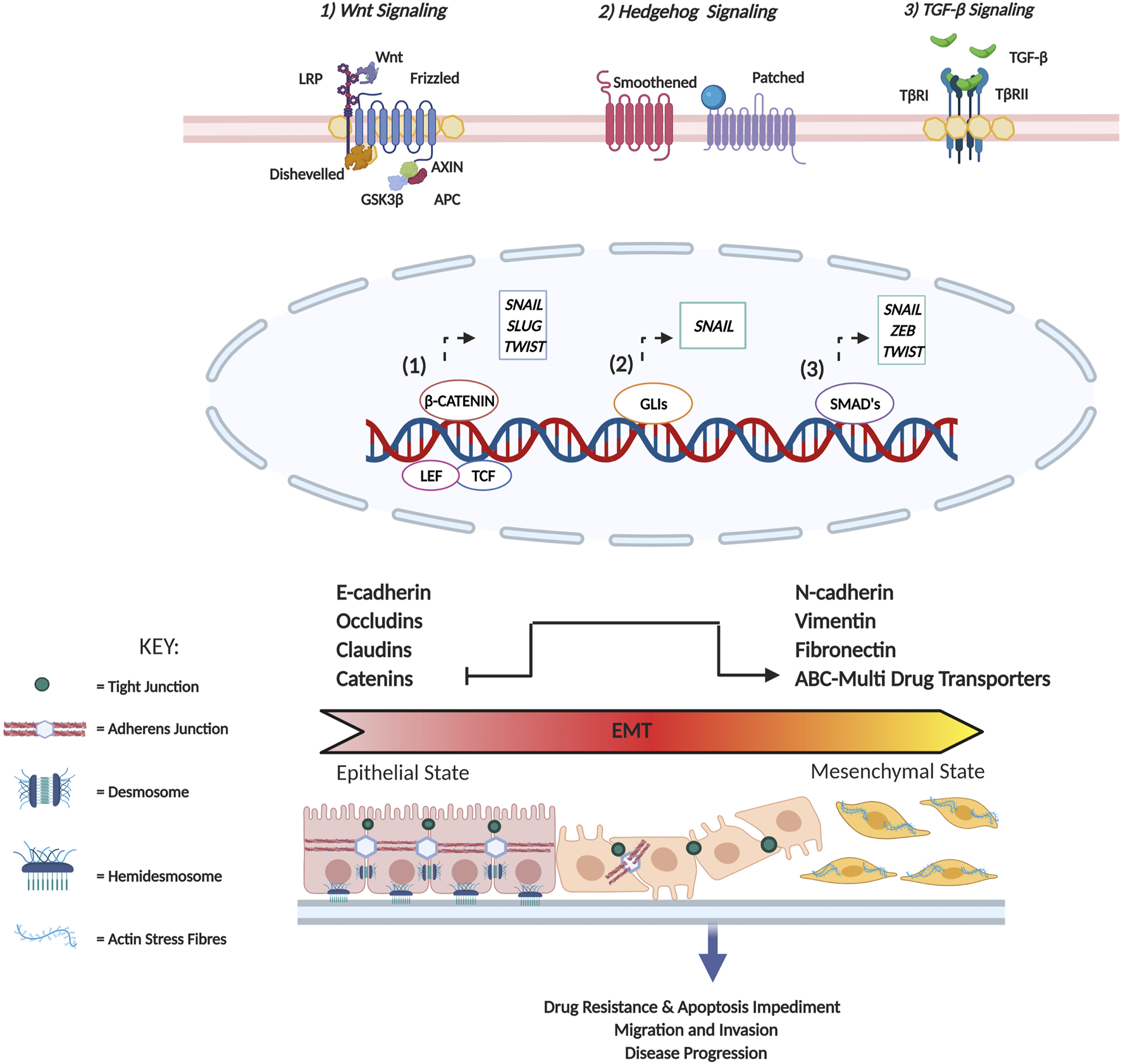 Summary of EMT induced changes in cellular physiology. In tissues, epithelial cells are often arranged as either a single layer or exist as multi-layered sheets. These cells are characterized by the presence of specialized contacts called cell junctions that facilitate cell-cell interaction (cadherin-based adherens junctions, tight junctions, and desmosomes) as well as cell-matrix interactions (hemidesmosomes) that maintain structural integrity and apical-basal polarity. In terms of cytoskeletal composition, Type I intermediate filaments such as cytokeratins are expressed, and adherens junctions serve to indirectly connect cortical actin filaments of two adjacent cells. On the contrary, mesenchymal cells are characterized by minimal cell junctions and detached stromal arrangements promoting front-rear polarity. In terms of cytoskeletal composition, vimentin is predominantly expressed to enhance cytoskeletal strength contributing to cell flexibility, and actin fibres arrange to form stress fibres. Additionally, the formation of actin-rich membrane projections facilitates cellular movement as well as sensory reception. Characteristic surface markers utilized to identify epithelial cells include E-cadherin, cytokeratins, occludins as well as claudins, while mesenchymal cells are identified based on the presence of N-cadherin, fibronectin, and vimentin. Cellular stimuli lead to the activation of several signaling pathways (Wnt, Sonic Hedgehog and TGF-β) that promote the expression of master EMT TFs (SNAIL, SLUG, TWIST and ZEB). Following activation of the EMT program these TFs facilitate the loss of several of the aforementioned epithelial characteristics, promote cytoskeletal remodeling and initiate a concomitant gain of mesenchymal traits. This transition consequently facilitates a change in cell morphology from squamous, cuboidal, columnar to a fibroblast/spindle-like morphology conferring upon cancer cells migratory and invasive potential.