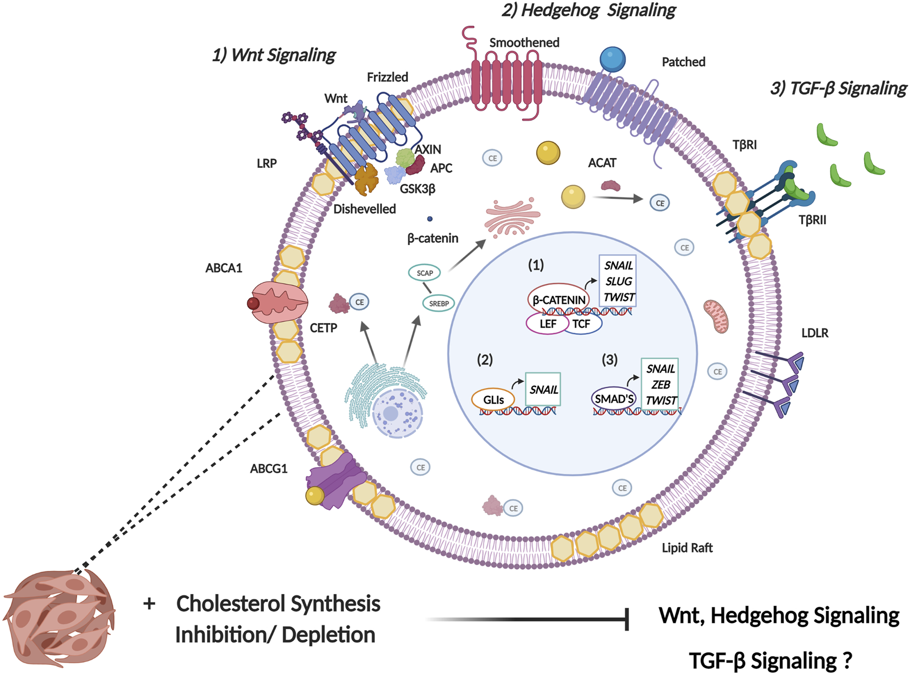 Cholesterol modulates signaling pathways involved in EMT induction. EMT is induced by several signaling pathways that facilitate the expression of EMT master transcription factors (SNAIL, SLUG, ZEB, and TWIST). 1) Canonical Wnt signaling is initiated following the binding of a Wnt ligand to Frizzled receptor. This consequently mediates the release of β-catenin from the glycogen synthase kinase 3-β (GSK3β), axis inhibition protein (AXIN), adenomatous polyposis coli (APC) protein destruction complex. This allows for increased stability of β-catenin where it enters the nucleus binding to the transcription factors T-cell factor (TCF) and lymphoid-enhancer factor (LEF) to induce transcription of EMT TFs. Primarily, Wnt binds to receptors in lipid raft domains and cholesterol facilitates recruitment of the Dishevelled to the plasma membrane. Collectively this facilitates activation of the canonical Wnt/β-catenin signaling. 2) Activation of canonical hedgehog signaling occurs through binding of the hedgehog ligand, sonic hedgehog (Shh) to the transmembrane receptor patched which leads to de-repression of Smoothened. Smoothened consequently activates the transcriptional activity of the GLI family of transcription factors. Cholesterol is necessary for post-translational modification of Hh ligands. Furthermore, the activity of the membrane transducer Smo is regulated directly by cholesterol through its cysteine-rich domain and also indirectly through Hh receptor PTCH1 which possesses a sterol-sensing domain. 3) Transmembrane signaling by TGF-β is initiated upon ligand binding to membrane bound serine/threonine kinase receptor, termed TGF-β type II receptor (TβR-II). This leads to recruitment of membrane bound TGF-β type I receptor (TβR-I) resulting in the formation of a heterotetrameric complex. The main mechanism of intracellular TGF-β signaling is mediated through the Smad family of transcription factors which serve to activate or repress TGFβ responsive genes. The role of cholesterol in modulating TGF-β signaling is complex and not fully understood, with some studies implicating cholesterol in TGF-β signaling, and other studies highlighting reduced cholesterol upon TGF-β induced EMT.