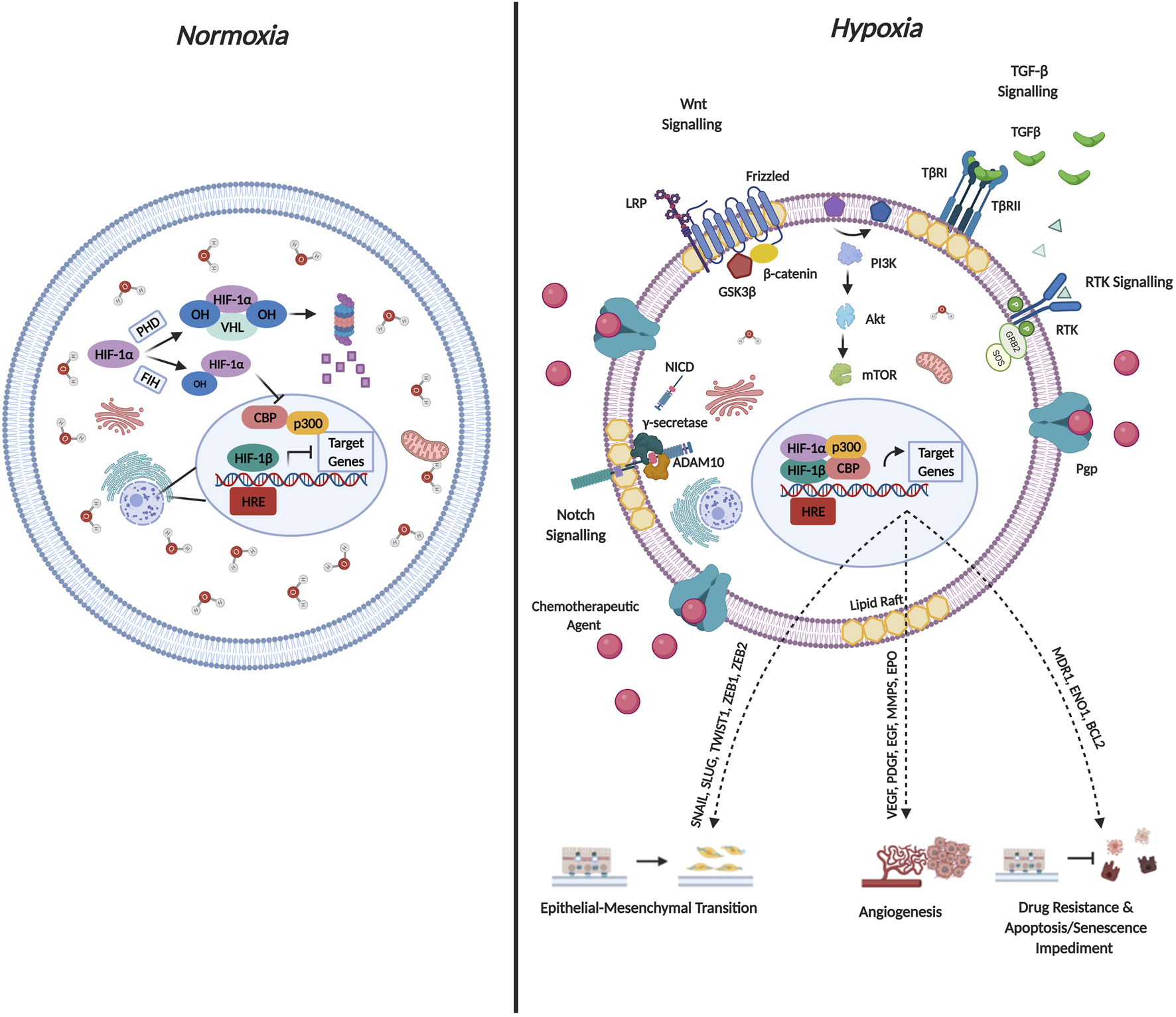 Molecular Mechanisms Governing HIF-1α Regulation and Cellular Function. Hypoxia-inducible factors (HIF’s) occur as heterodimers containing an oxygen sensitive subunit (α) and a constitutively expressed β subunit. Both subunits possess a basic helix-loop-helix (bHLH) as well as PER/ARNT/SIM (PAS) domain that is required for DNA binding and dimerization. The oxygen dependent degradation domain (ODD) of HIF-1α mediates oxygen dependent degradation. Under normoxic conditions, prolyl hydroxylase enzymes, hydroxylate HIF-1α on conserved Pro residues within the ODD facilitating von-Hippel-Lindau mediated ubiquitination and subsequent proteasomal degradation. Additionally, Asn-hydroxylation mediated by factor-inhibiting HIF-1α impedes interaction with the co-activators p300/CBP co-activator. Both mechanisms are documented to abrogate HIF transcriptional activation under normoxic conditions. Under conditions of hypoxia, the hydroxylases lose their activity, leading to HIF-1α stabilization. HIF-1α subsequently translocates to the nucleus and binds to HIF-1β as well as the p300/CBP co-activator forming a complex. The activated complex binds to multiple hypoxia-responsive elements (HREs) in the promoter regions to activate transcription of target genes. The concomitant expression of target genes mediates cancer aggressiveness through EMT and angiogenesis induction as well as drug resistance and apoptosis impediment.