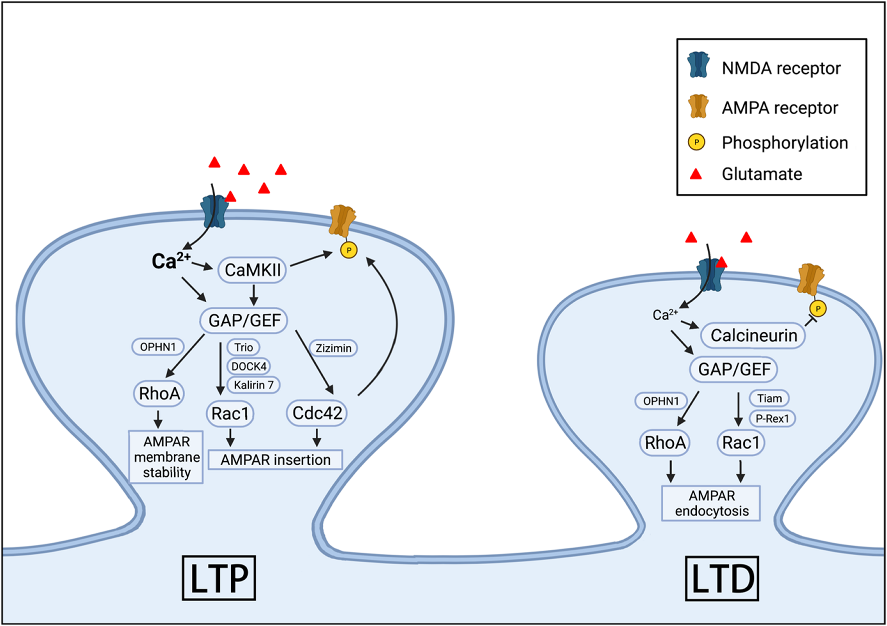 Rho GTPases in AMPAR expression, LTP and LTD. RhoA, Cdc42, and Rac1 can participate in the regulation of the synaptic insertion, internalization and membrane stability of AMPARs during LTP and LTD. These GPTases are activated by NMDARs or other surface proteins through various GAPs and GEFs.