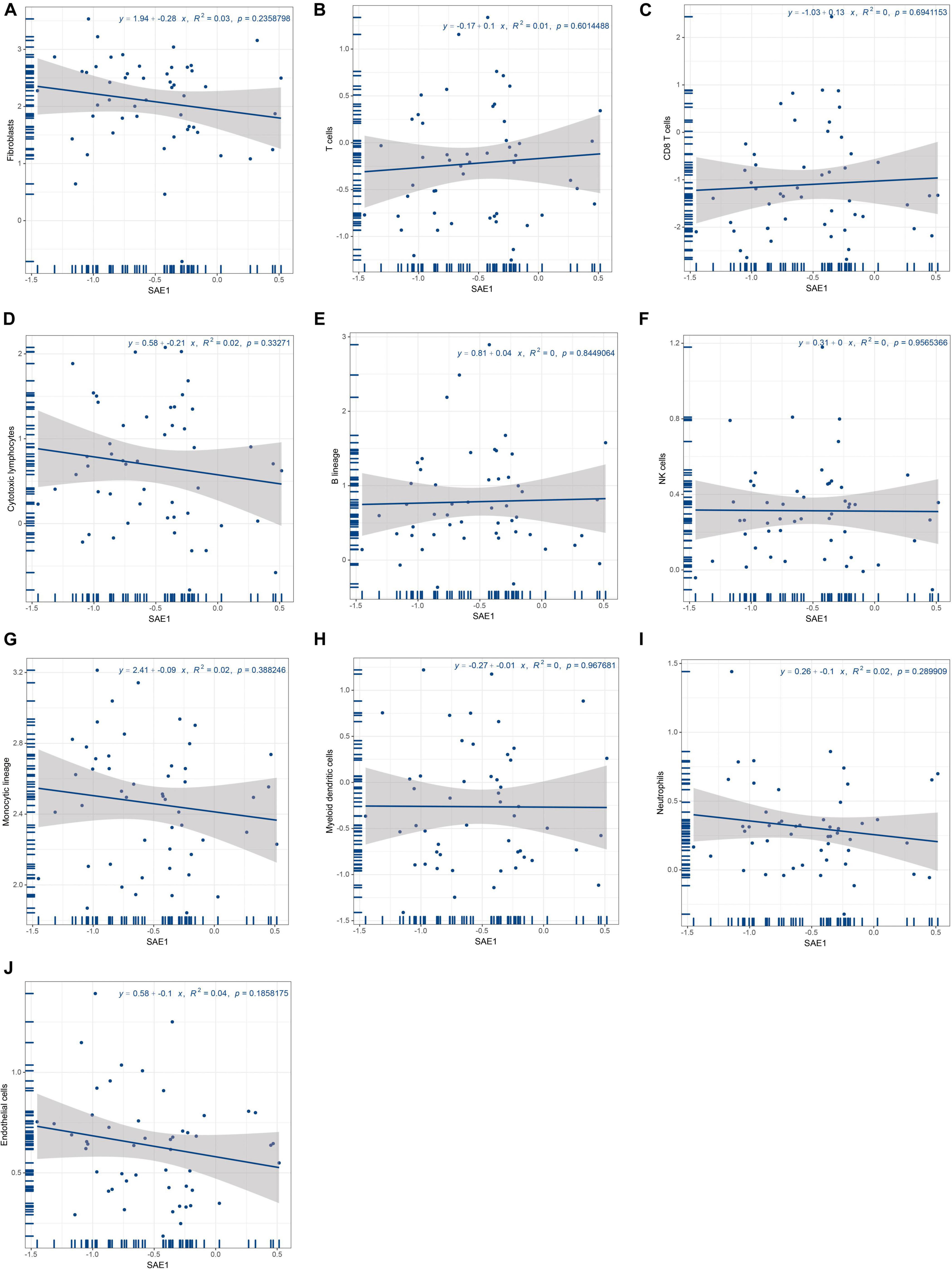 Figure 4. Relationships of SAE1 with tumor-infiltrating immune cells. (A) Correlation between SAE1 expression and fibroblasts. (B) Correlation between SAE1 expression and T cells. (C) Correlation between SAE1 expression and CD8 T cells. (D) Correlation between SAE1 expression and cytotoxic lymphocytes. (E) Correlation between SAE1 expression and B lineage. (F) Correlation between SAE1 expression and NK cells. (G) Correlation between SAE1 expression and monocytic lineage. (H) Correlation between SAE1 expression and myeloid dendritic cells. (I) Correlation between SAE1 expression and neutrophils. (J) Correlation between SAE1 expression and endothelial cells.