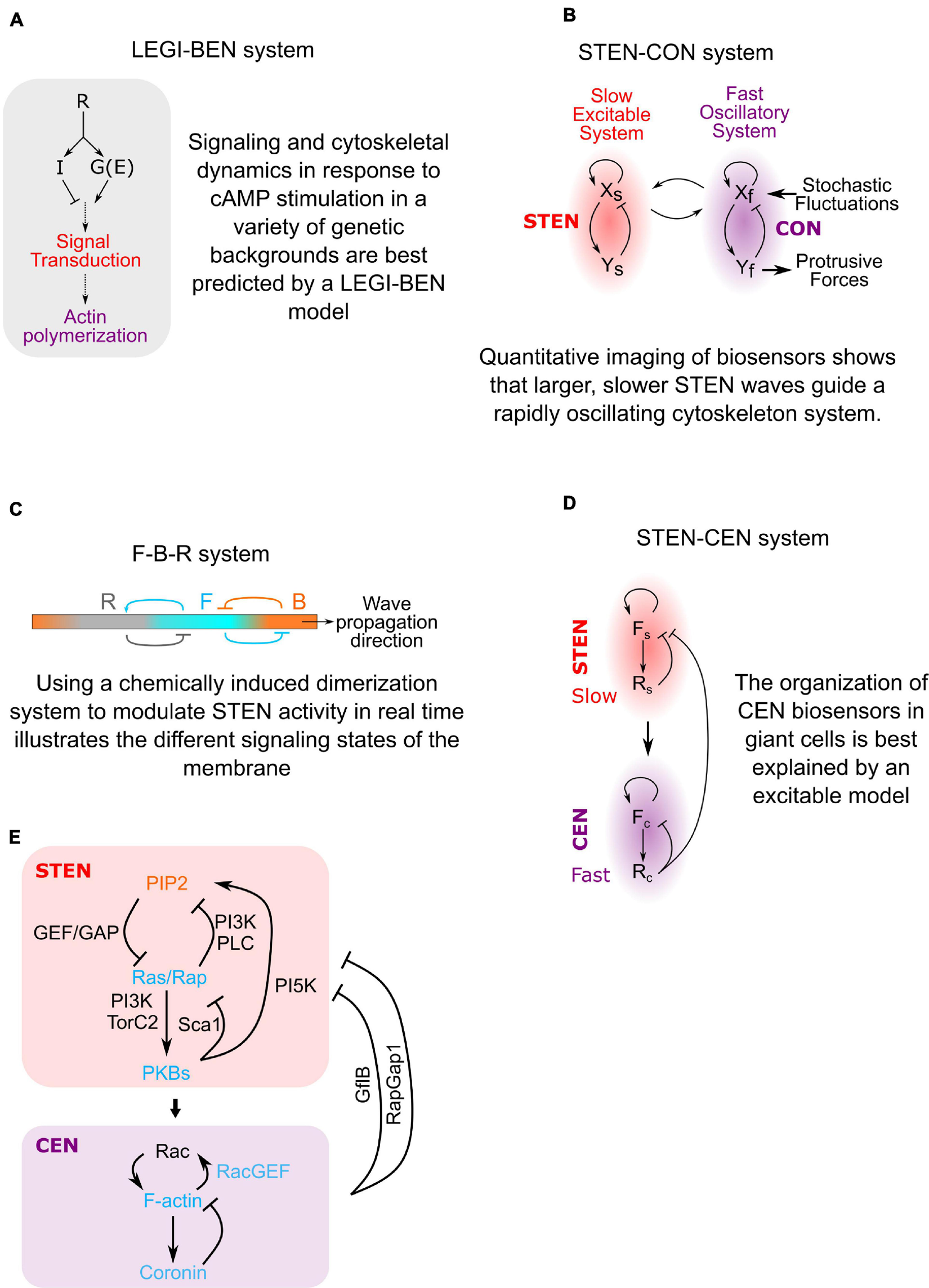 Figure 2. The evolution of directed migration models. (A) By monitoring how signaling and cytoskeletal dynamics change during cAMP stimulation in different genetic backgrounds we were able to build a model of gradient-sensing. The cell has two responses to Receptor (R) activation: locally, heterotrimeric G-proteins (G) create an Excitor (E) of signal transduction excitation. Globally, the cell produces an Inhibitor (I) which lowers the probability of excitation. This Local Excitation and Global Inhibition (LEGI) of a Biased Excitable Network (BEN) explains how cells moves in the correct direction even in shallow gradients. (B) Imaging of signaling biosensors independent of cytoskeletal proteins revealed excitable behavior. In the absence of signaling activity, cytoskeletal biosensors rapidly oscillate at small membrane patches. The Cytoskeletal Oscillatory Network (CON) is only able to form large, sustained protrusions when driven by the Signal Transduction Excitable Network (STEN). (C) Using data from chemically induced dimerization perturbations, a model of how cell front and back activities are segregated was created. The membrane sits in a resting state equivalent to the cell back state (B). STEN excitation converts a patch of the membrane to a front state (F). This F state inhibits the B state but also gradually creates its own inhibitor that converts F-state membrane to a refractory state (R). This explains how activities like Ras activation and actin polymerization propagates across cell membranes but is transient at any single location. (D) Biosensor dynamics show that the cytoskeletal network also has excitable properties. The Cytoskeletal Excitable Network (CEN) is coupled to the STEN but works on a faster timescale, explaining the structure of STEN-CEN waves on the bottom membrane of giant cells. (E) Diagram of the STEN-CEN network sketched out in panel (D) with specific molecules added.