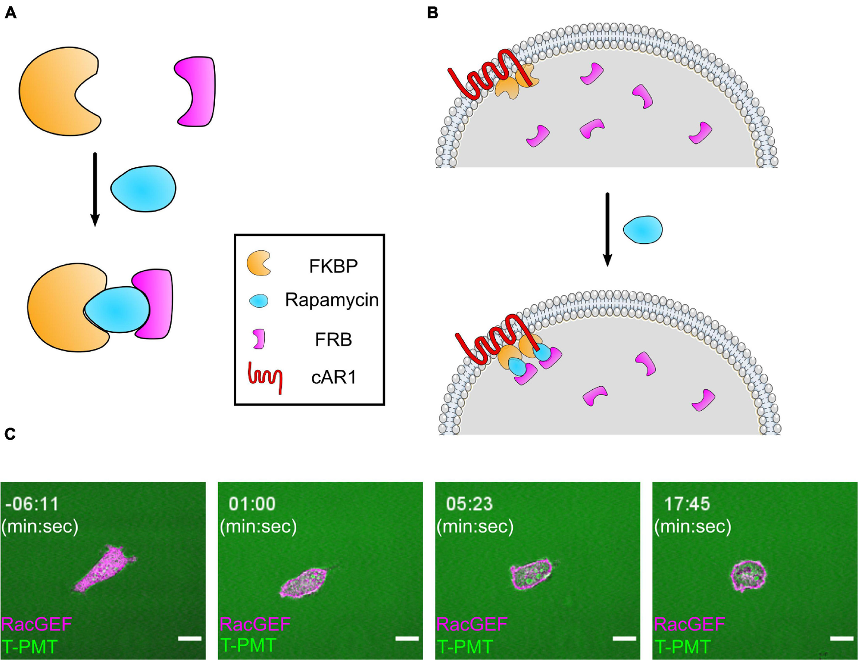 Figure 4. The FKBP/FRB system and its application in cells. (A) Diagram of FKBP/FRB system. FKBP and FRB form a heterodimer in the presence of rapamycin. (B) Illustration of an experimental setup for recruiting a protein to the membrane with the FKBP/FRB system in Dictyostelium. 2 FKBP domains (FX2) are anchored to membrane by cAR1, and the actuator attached to an FRB domain is diffusing in the cytosol. When rapamycin is added, the actuator is recruited to membrane by binding to FKBP. (C) Scanning confocal imaging of an AX3 Dictyostelium cell expressing a CID system designed to increase RacB and Rac1A activity. The cell is expressing cAR1-FKBP-FKBP (unlabeled) and mCherry-FRB-RacGEF1ΔN, an activator of Rac1 fused to an FRB domain. After rapamycin addition, RacGEF1ΔN is recruited to the membrane. Consistent with previous reports, the cell became very round with small, short-lived protrusions. Scale bars = 10 μm. t = 00:00 indicates rapamycin addition.