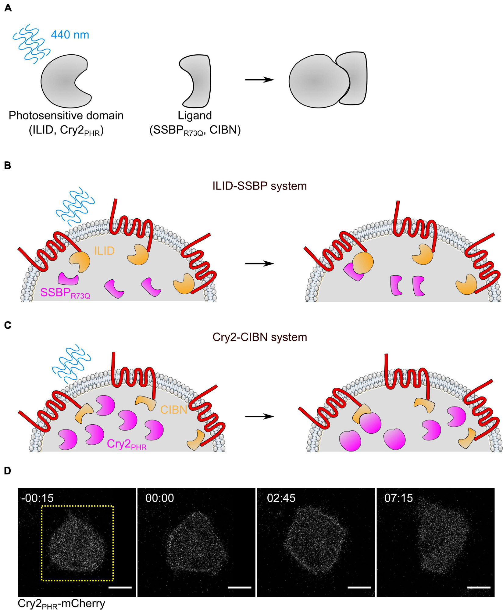 Figure 5. Optogenetic systems for controlling protein localization in Dictyostelium. (A) Diagram of blue light dimerization systems. In the dark, a photosensitive protein (iLID or Cry2PHR) has low affinity for its ligand (SSBPR73Q or CIBN, respectively). When exposed to 450 nm light, a conformational change in the photosensitive domain allows it to bind to the ligand with affinity. (B,C) Diagram of iLID-based (B) and Cry2-based (C) systems for recruiting proteins to the membrane in Dictyostelium. The actuator (magenta) is recruited to the uniformly distributed membrane anchor (orange) only at the area exposed to blue light. Note that in the iLID system, the photosensitive protein is attached to the membrane anchor, while in the Cry2 system, it is attached to the cytosolic actuator. (D) Scanning confocal imaging of Cry2PHR membrane recruitment in AX3 Dictyostelium cells. Cells are also expressing an unlabeled membrane anchor, cAR1-CIBN. Yellow dashed square indicates region illuminated with 488 nm light. Scale bars = 5 μm. t = 00:00 indicates blue light stimulation.