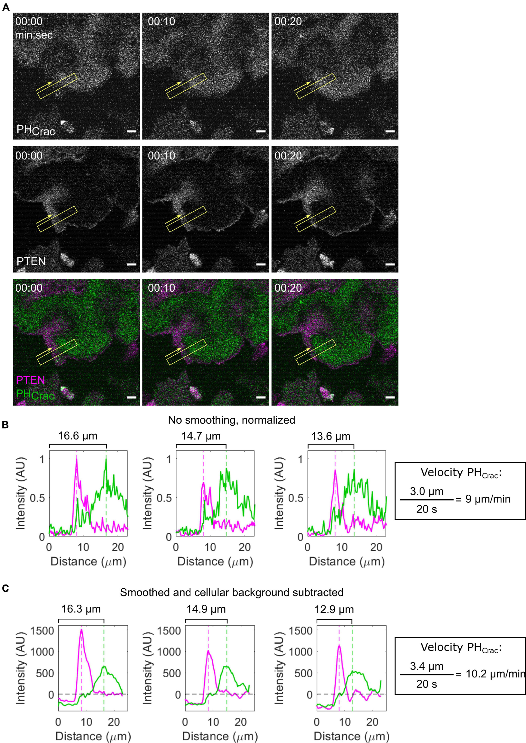 Figure 6. Measuring STEN wave properties. (A) Scanning confocal imaging of PIP3 (PHCrac) and a back protein (PTEN) in a giant AX2 Dictyostelium cell. Yellow boxes indicate the location and width of the intensity line scan across a membrane wave. Yellow arrows indicate the direction of the line scan. (B,C) Raw (B) and smoothed and background-corrected (C) Intensity line scans corresponding to the timepoints in panel (A). The position of the linescan area does not change, while the peak position of PHCRAC decreases. This change can be used to calculate the velocity of the front wave.