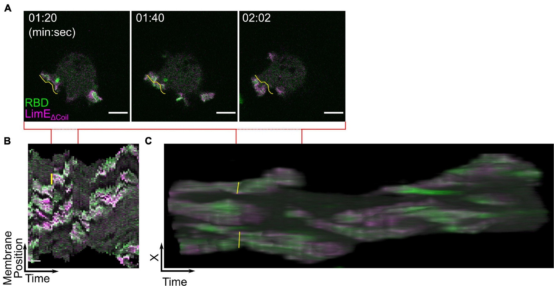Figure 7. Displaying biosensors on cell protrusions. (A–C) Scanning confocal imaging (A), membrane kymograph (B), and t-stack (C) of Ras activation (RBD) and actin polymerization (LimEΔCoil) in AX3 Dictyostelium cells. The yellow line highlights the same protrusion in all three images. Scale bars in panels (A) = 5 μm and (B) = 30 s. t = 00:00 indicates the start of acquisition. Red lines indicate the span of time covered by the still images in panel (A).