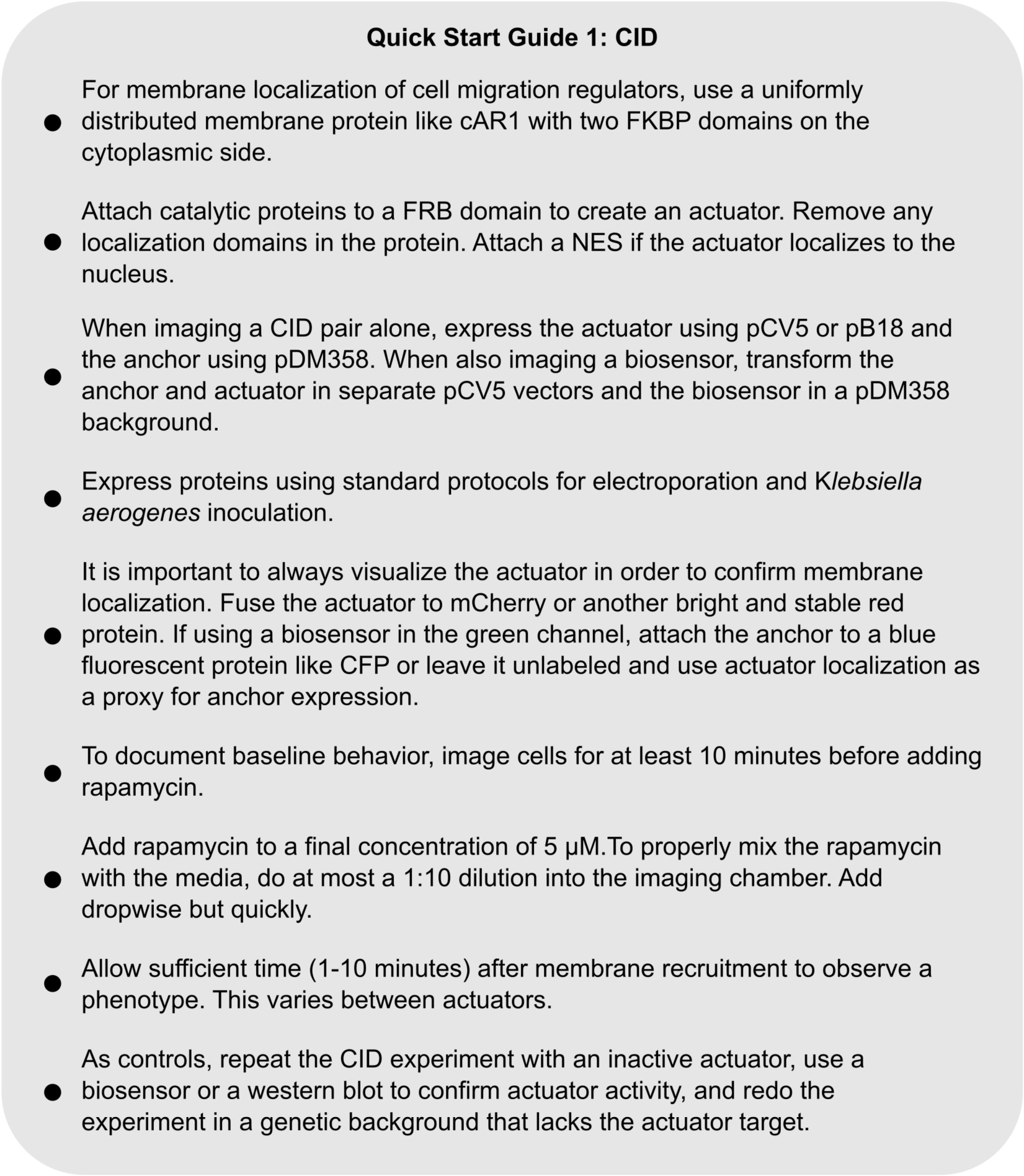 The CID system allows researchers to separate how changes in different parts of the directed migration network affect cell function. For example, a truncated, membrane-recruitable RacGEF1 can be used to increase actin polymerization across the cell membrane (Figure 4C and Supplementary Movie 1). While cAMP stimulation leads to actin polymerization through a signaling cascade, this perturbation directly activates the actin nucleator WASP. Similar to cAMP stimulation and STEN activation, RacGEF1 membrane recruitment causes cells to flatten out as actin polymerizes in all directions (Figure 4C and Supplementary Movie 1) (Miao et al., 2019). However, unlike upstream perturbations, direct upregulation of actin polymerization leads to a large decrease in Ras activation (Miao et al., 2019). This negative feedback from CEN to STEN was only uncovered by choosing a specific downstream entry point into the chemotaxis pathway. When designing FKBP-FRB experiments in Dictyostelium like this one, there are many important considerations in design and execution, which will be discussed below. For a summary of these considerations, see Quick Start Guide 1.