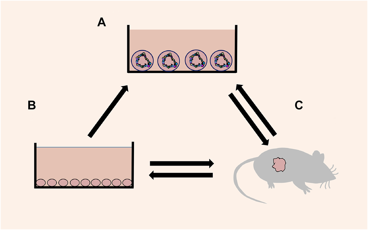 Schematic diagram of mutual transformation. (A) Organoids: a 3D cell culture, which reproduces the cell composition, morphological structure and other characteristics of the source tissue. (B) Cell lines: a 2D cell culture consisting of a single cell. (C) Xenografts: transplantation of human tissue/cells or directly induced animal models.