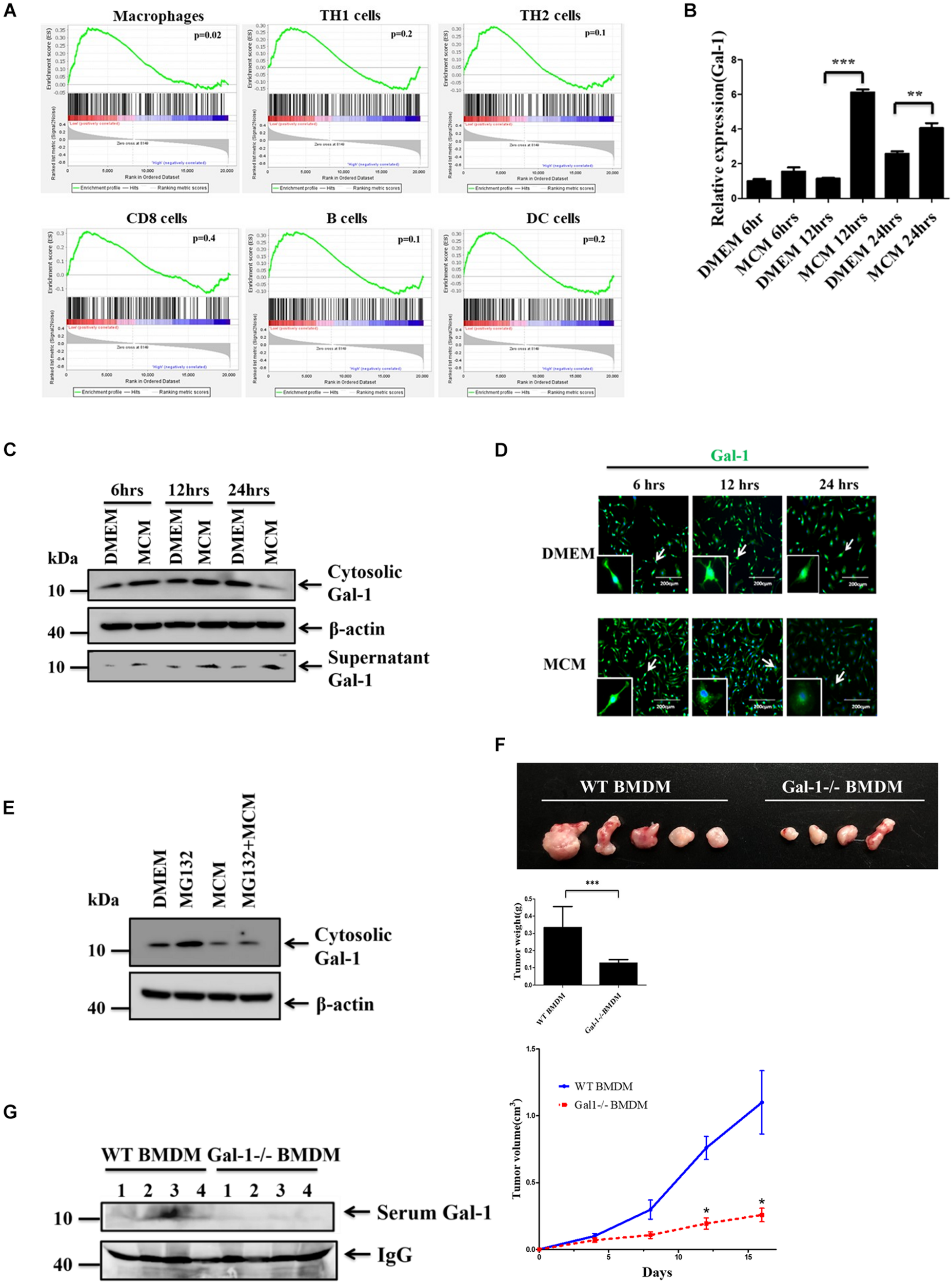 HCC cells stimulate macrophages to actively secrete Gal-1. (A) GSEA of Gal-1 mRNA expression in HCC-associated immune cells. The data of Gal-1 mRNA expression in human liver cancer patients was obtained from the cancer genome atlas (TCGA) database. Enrichment scores (ES) are shown on the y-axis. X-axis bars represent individual genes of immunologic signature gene sets. Color bars represent the expression level of Gal-1. Positive and negative ES indicate enrichment of immunologic signature gene sets in high expression galectin-1 and low expression galectin-1, respectively. (B–D) BMDMs were treated with MCM at indicated time. The expression levels of Gal-1 mRNA were determined by qRT-PCR and quantified (B). The expression of cytosolic Gal-1, β-actin as well as supernatant Gal-1 proteins was determined by Western blotting (C) or immunofluorescence staining (D). All blots were derived from a single experiment. (E) BMDMs were pretreated with or without MG132 (0.25 μM) for 1 h prior to adding MCM. The expression of cytosolic Gal-1 and β-actin was determined by Western blotting. All blots were derived from a single experiment. (F,G) 5 × 105 ML-14a cells mixed with 5 × 105 WT or Gal-1 -/- BMDMs were subcutaneously inoculated into nude mice (n = 5). Tumor volume was measured every 4 days after inoculation. All mice were sacrificed on day 16. The representative images of HCC tumors were shown, and the tumor weights were quantified (F). The expression of galectin-1 in mice serum was measured by Western blotting (G). All blots were derived from a single experiment. *p < 0.01; **p < 0.001; ***p < 0.0001.