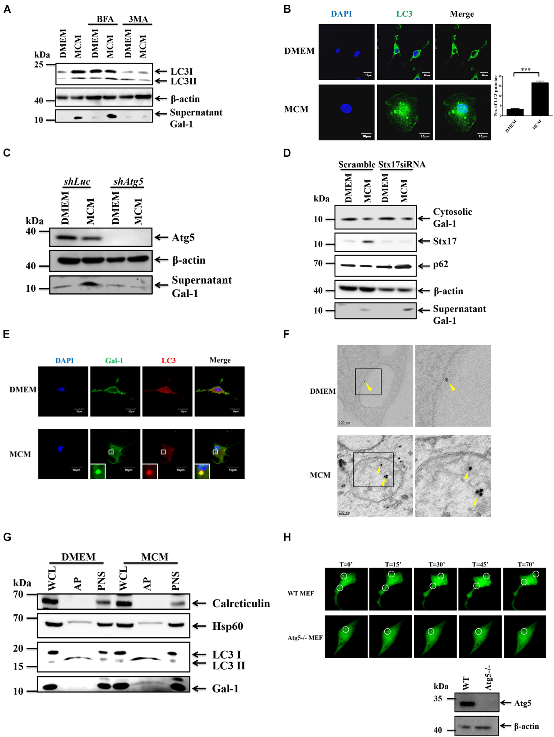 Gal-1 secretion is mediated by autophagy. (A) BMDMs were pretreated with 3MA (2 mM) or Brefeldin A (30 nM) for 1 h and then treated with MCM for another 24 h. The expression of cytosolic LC3-I/II, β-actin, and supernatant G-1 proteins was determined by Western blotting. All blots were derived from a single experiment. (B) BMDMs were treated with MCM for 12 h and stained with anti-LC3 antibody. The LC3 aggregation (green) was observed by confocal microscopy. Scale bar = 10 μm. (C) RAW 264.7 cells stably expressing luciferase (Luc) or Atg5 shRNA were treated with MCM for 24 h. The expression of cytosolic Atg5, β-actin, and supernatant Gal-1 proteins was determined by Western blotting. All blots were derived from a single experiment. (D) RAW264.7 cells were transfected with control or Stx17 siRNA at 10 μM for 24 h and then treated with MCM for another 24 h. The expression of cytosolic Gal-1, Stx17, p62, β-actin, and supernatant Gal-1 proteins was determined by Western blotting. All blots were derived from a single experiment. (E) BMDMs were treated with MCM for 12 h and stained with anti-Gal-1 (green) and -LC3 (red) antibodies. The distribution of these proteins was analyzed by confocal microscopy. Scale bar = 10 μm. (F) BMDMs were treated with MCM for 6 h to detect Gal-1 by immunoelectron microscopy. Gold nanoparticle-labeled Gal-1 (arrow bead) in the autophagosomes was observed under a transmission electron microscope. Scale bar = 60 nm. (G) RAW 264.7 cells were treated with MCM for 6 h to isolate autophagosomes. The expression of calreticulin, HSP60, LC3-I/II, and Gal-1 proteins in different cell components was determined by Western blotting. WCL: whole cell lysates; PNS: post-nuclear supernatants; AP: autophagosomes. All blots were derived from a single experiment. (H) WT and Atg5-/- MEF cells were transfected with Gal-1-GFP to monitor the Gal-1 trafficking by TIRF microscopy. Selected frames from time-lapse TIRF microscopy with time intervals in seconds are shown. The protein expression of Atg5 of WT and Atg5-/- MEFs was determined by Western blotting (bottom right corner). All blots were derived from a single experiment.
