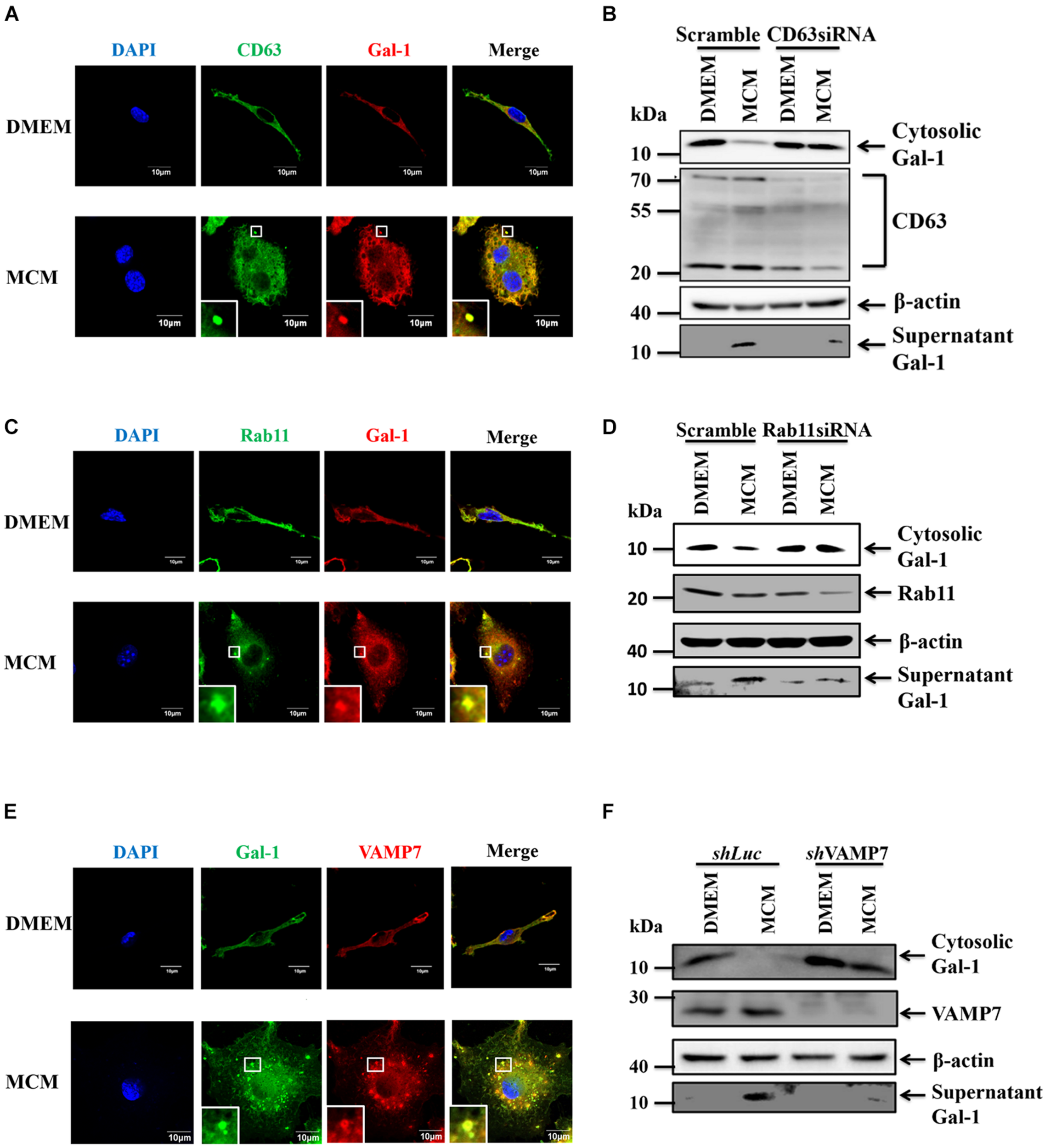 We next went further to address the pathways involved in autophagy-dependent Gal-1 secretion. MVBs are the endosome molecules that can interact with the autophagosomes to form hybrid structures called amphisomes to facilitate protein secretion (Hessvik and Llorente, 2018). Hence, we investigated whether the MVBs are involved in the secretion of Gal-1. To examine this, we first checked the co-localization of CD63, an MVB marker, and Gal-1 by confocal immunofluorescence microscopy. As shown by the results in Figure 3A, Gal-1 was found to co-localize with CD63 in MCM-treated macrophages. Then, the CD63 was knocked down by siRNA to examine MVB contribution on Gal-1 secretion. This was followed by Western blot analysis, where the recovery of cytosolic Gal-1 along with the reduction of supernatant Gal-1 was observed in CD63 silencing MCM-treated macrophages compared with control cells (Figure 3B). These data indicate the involvement of MVB in the secretion of Gal-1. Rab GTPase family proteins are well-studied key regulators of vesicle trafficking and protein secretion. One of these proteins, called Rab11, has been shown to play a pivotal role in amphisome-mediated protein secretion (Hessvik and Llorente, 2018). Thus, we examined whether Rab11 participates in Gal-1 secretion. According to our immunostaining observation, Rab11-positive vesicles were found to co-localize with Gal-1 (Figure 3C). Knockdown of Rab11 by siRNA significantly reduced secretion of Gal-1 from MCM-treated macrophages (Figure 3D), suggesting that Rab11 is essential for Gal-1 secretion. Furthermore, Rab11 is reported to interact with one of the SNARE proteins called VAMP7 to promote vesicle trafficking (Kandachar et al., 2018). Hence, we further investigated the role of VAMP7 in the secretion of Gal-1. Consistent with what we found in Figures 3C,D, the confocal image analysis has revealed a significant co-localization between the VAMP7 and Gal-1 (Figure 3E). Silencing of VAMP7 abrogated the supernatant level of Gal-1 in MCM-treated macrophages (Figure 3F). These results collectively suggest that an MVB/Rab11/VAMP7 axis facilitates the autophagy-mediated secretion of Gal-1.