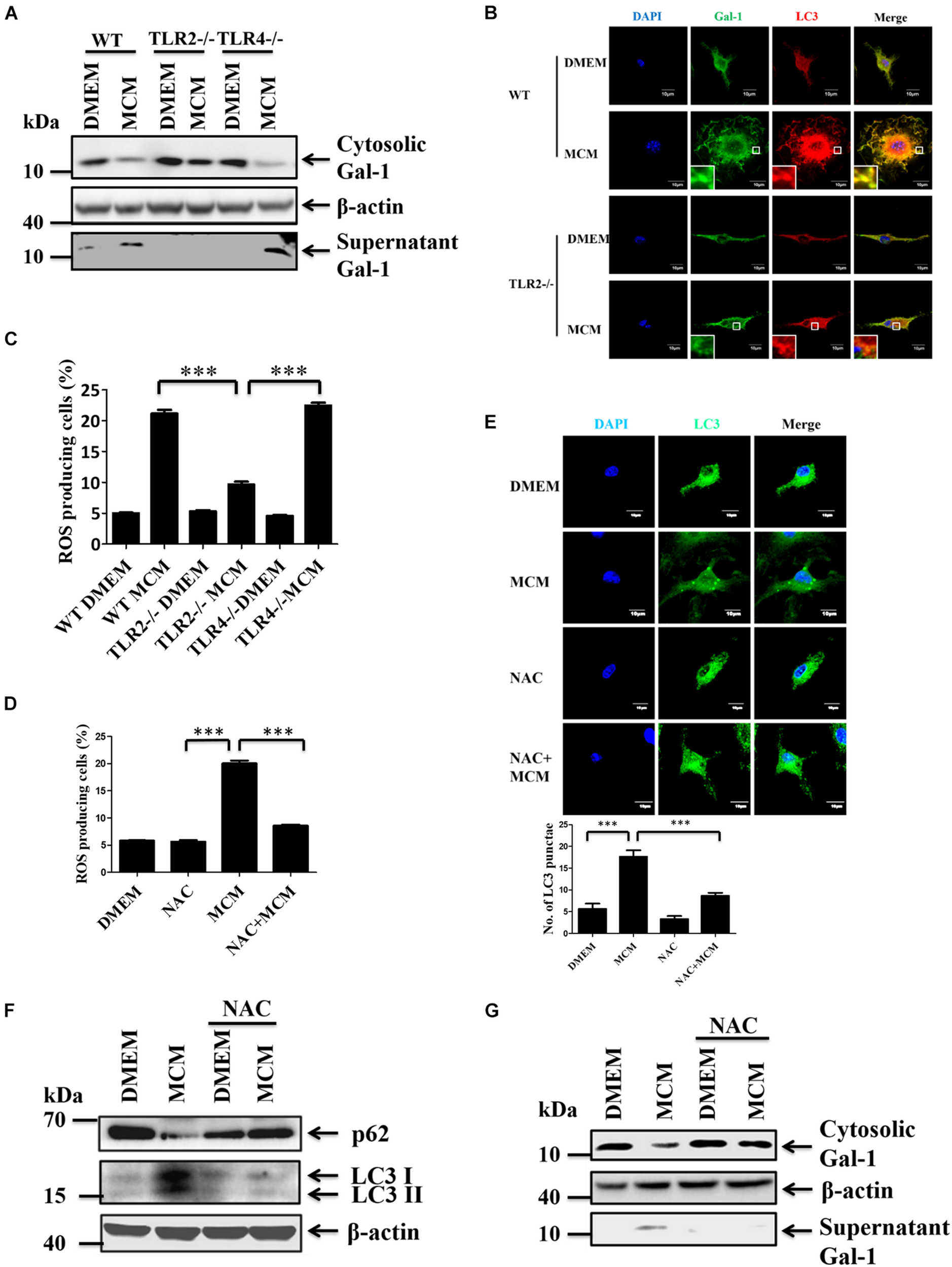 TLR2-mediated ROS production induces autophagy and Gal-1 secretion. (A) WT, TLR2-/- or TLR4-/- BMDMs were treated with MCM for 24 h. The expression of cytosolic Gal-1, β-actin, and supernatant Gal-1 proteins was determined by Western blotting. All blots were derived from a single experiment. (B) WT or TLR-/- BMDMs were treated with MCM for 12 h and then stained with anti-Gal-1 (green) and anti-LC3 (red) antibodies. The co-localization of Gal-1 and LC3 was observed by confocal microscopy. Scale bar = 10 μm. (C) WT, TLR2-/- or TLR4-/- BMDMs were treated with MCM for 12 h. The ROS production of these cells was analyzed by flow cytometry and quantified. (D–F) BMDMs were pretreated with or without NAC (4 mM) for 1 h and then treated with MCM for another 12 h. The ROS production of these cells was analyzed by flow cytometry and quantified (D). The LC3 dots were observed by confocal microscopy and quantified (E). The expression of cytosolic p62, LC3-I/II, and β-actin proteins was determined by Western blotting (F). All blots were derived from a single experiment. (G) BMDMs were pretreated with or without NAC (4 mM) for 1 h and then treated with MCM for another 24 h. The expression of cytosolic Gal-1, β-actin, and supernatant Gal-1 proteins were determined by Western blotting. All blots were derived from a single experiment. ∗∗∗p < 0.0001.