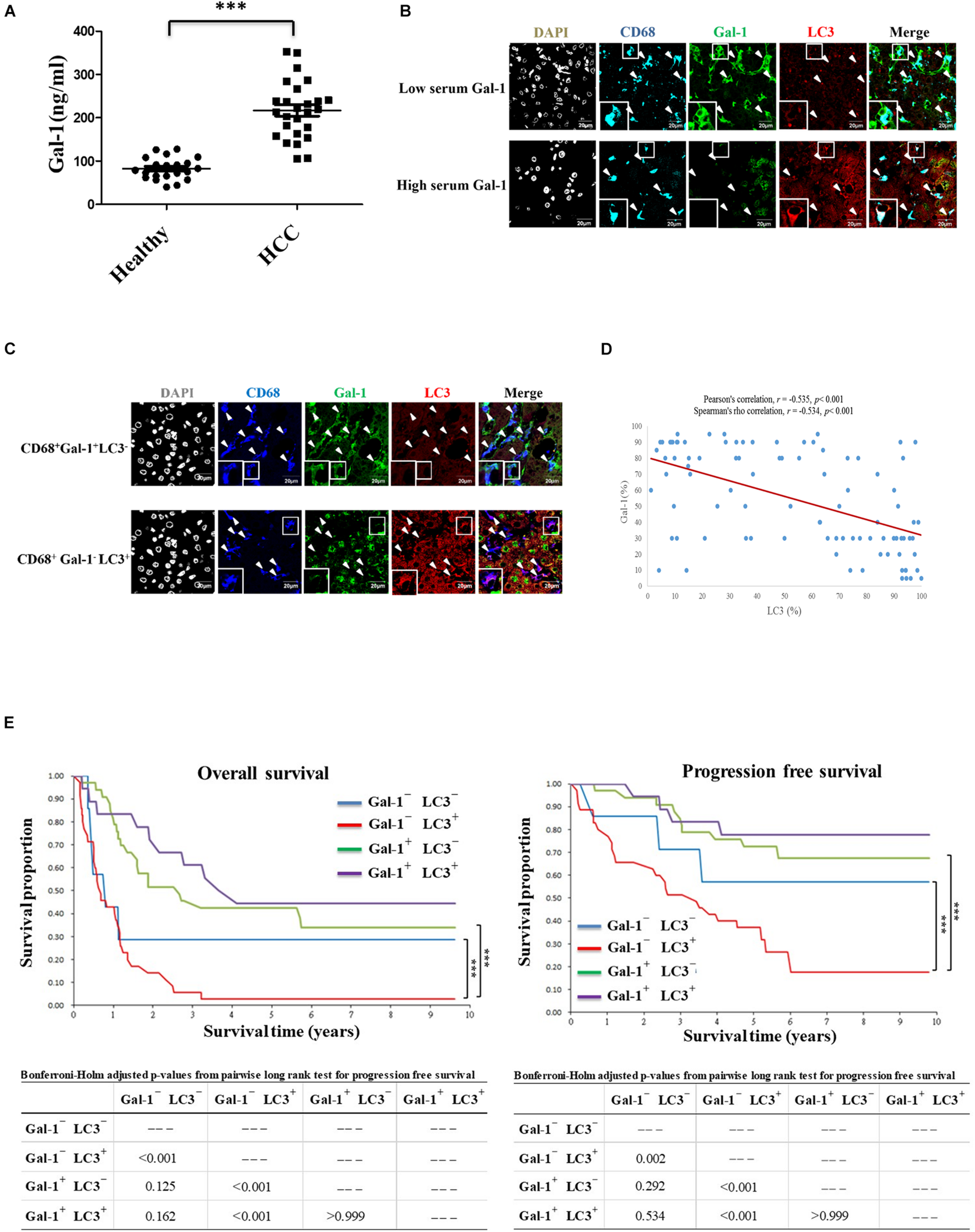 Intratumoral Gal-1–LC3+ TAMs correlate to the poor OS and PFS rates of HCC patients. (A) Serum levels of Gal-1 in healthy donors (n = 21) and HCC patients (n = 25) were analyzed by ELISA. ∗∗∗p < 0.0001. (B) Liver tumor sections from HCC patients with high or low serum levels of Gal-1 were stained with anti-CD68 (blue), anti-Gal-1 (green), and anti-LC3 (red) antibodies. Representative images show the protein distribution as observed by confocal microscopy. Scale bar = 20 μm. (C–E) Liver tumor sections of 93 retrospectively recruited HCC patients were stained with anti-CD68 (blue), anti-Gal-1 (green), and anti-LC3 (red) antibodies. Representative images show the protein distribution as observed by confocal microscopy (scale bar = 20 μm) (C). The expression correlation between LC3 and Gal-1 in CD68+ TAMs was analyzed by Bivariate correlation analysis using Pearson’s correlation (r = −0.535, p < 0.001) as well as Spearman’s correlation (r = −0.534, p < 0.001) (D). The OS and PFS rates of TAMs carrying Gal-1– LC3–, Gal-1– LC3+, Gal-1+ LC3–, or Gal-1+ LC3+ HCC patients were analyzed by Kaplan-Meier survival analyses (E).