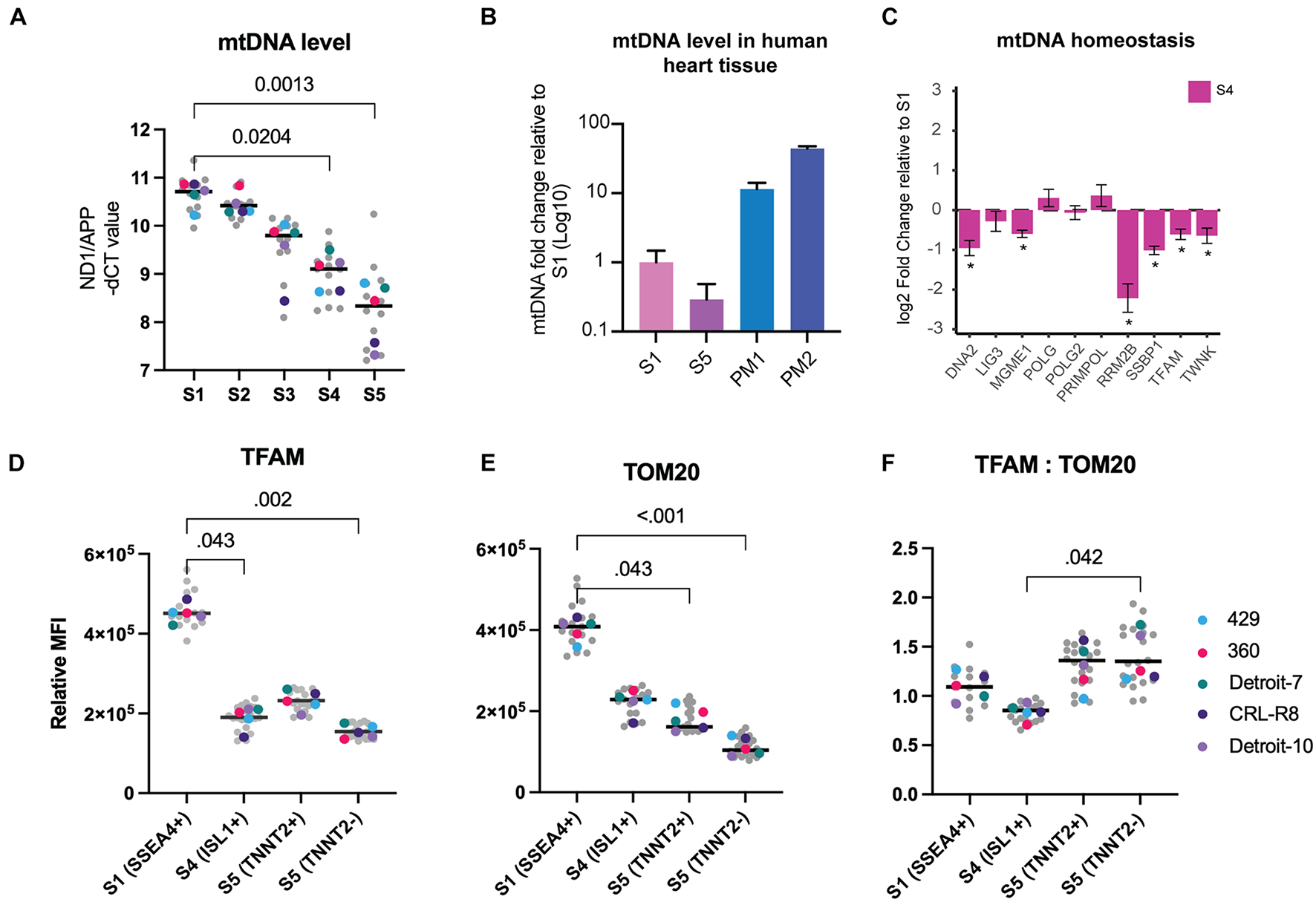 Figure 2. Mitochondrial mass and mtDNA decrease progressively during mesoderm differentiation. (A) MtDNA copy number measured during mesoderm differentiation. MtDNA level was calculated by assessing the ratio of ND1 (mtDNA gene) to APP (nuclear gene). Each data point in gray reflects a single experiment (mtDNA level of a single line from one run of differentiation at a specific stage), and each colored dot represents the median mtDNA level of each line for each stage. The black line is the median of total measurements for each specific stage. Statistical significance was assessed using a nonparametric, one-way ANOVA test followed by correction for multiple comparisons (Friedman test with Dunn’s multiple comparison test), n = 5. (B) MtDNA levels were significantly lower in both S1 and S5 cells compared with human heart tissue. The bar chart shows the average mtDNA level in cells collected from five hiPSC lines in S1 and S5 and compares this with the mtDNA levels of cells isolated from postmortem heart tissues (PM1: 59 years, female, died of lung cancer; and PM2: 65 years, male, died of colon cancer). (C) We used RNA-seq from dataset A (all five lines included) to assess mtDNA homeostasis and replication machinery in Isl1+ progenitor cells. Several genes involved in mtDNA replication exhibited significant drops in S4 relative S1. (D) Using TFAM as a surrogate for mtDNA, we measured TFAM levels in different cell types across three different stages of differentiation using flow cytometry, and we detected a significant loss of TFAM at stages S4 and S5 compared with S1. There was also a significant difference in TFAM levels between TNNT2+ and TNNT2– cells. (E) We measured TOM20 using the same methodology and found a similar significant decrease at S4, and further reduction at S5. TNNT2+ cells demonstrated significantly higher levels of TOM20 relative to TNNT2– cells. (F) The ratio of TFAM:TOM20 increased significantly from stage S4 to stage S5 of cardiac differentiation. Since TFAM binds mtDNA in stoichiometric amounts and TOM20 reflects mitochondrial content, this suggests that mtDNA levels increased per unit mitochondrial volume. In (D–F), each data point in gray reflects a single experiment (MFI level of a single line from one run of differentiation at specific stage), and each colored dot represents the median MFI level of each line for each stage. The black line is the median of total measurements for each specific stage. Statistical significance was assessed using a nonparametric one-way ANOVA test followed by correction for multiple comparisons (Friedman test with Dunn’s multiple comparison test), n = 5. mtDNA, mitochondrial DNA; hiPSC, human induced pluripotent stem cell; MFI, median fluorescence intensity.