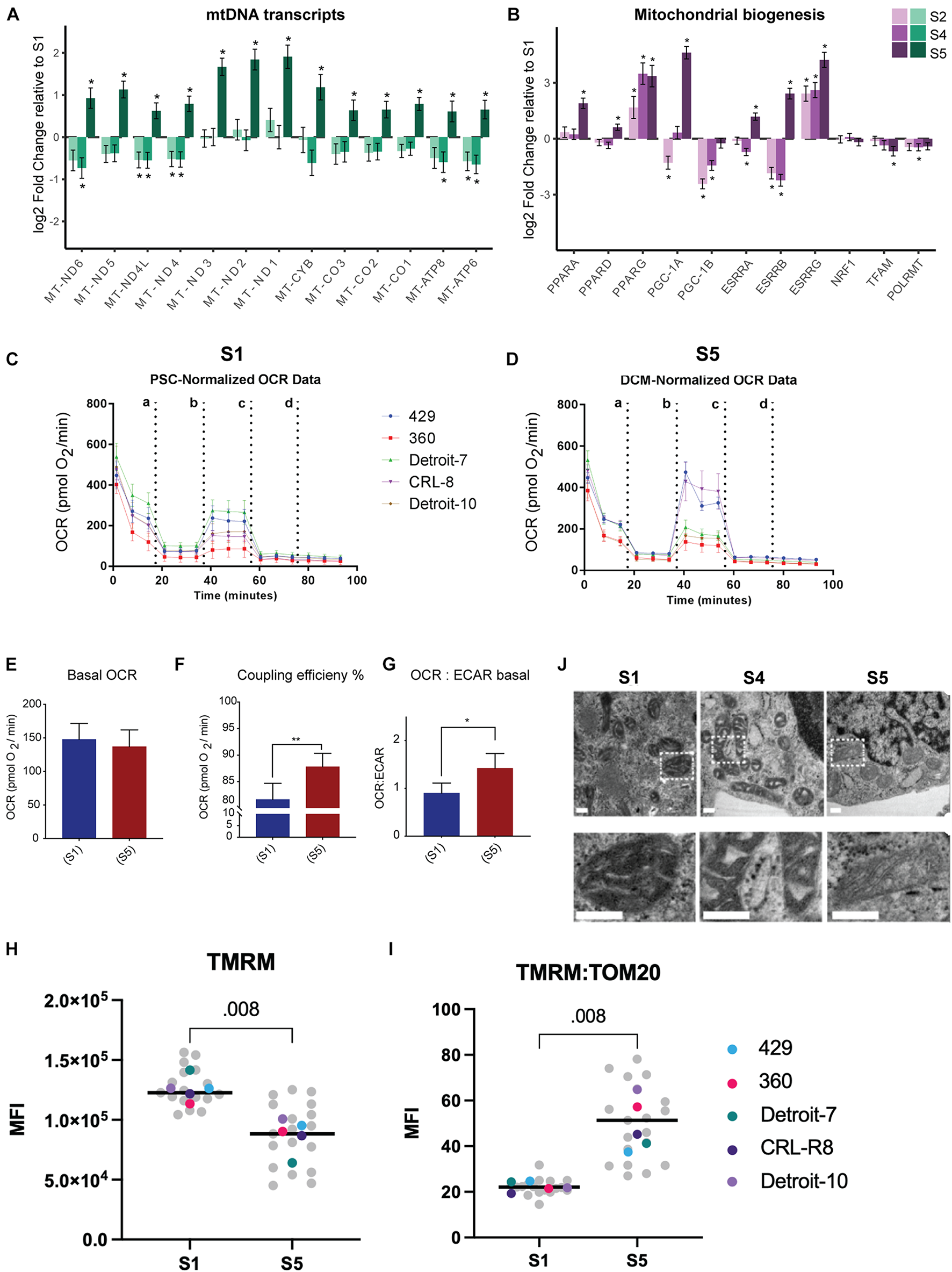 Figure 3. Higher mitochondrial respiration in differentiated mesodermal derivatives despite lower mitochondrial content. (A) The mtDNA transcripts collected via RNA-seq (Dataset B) at different stages of mesoderm differentiation suggest a significant increase in the number of mitochondrial transcripts in S5 relative to S1. (B) A panel of genes associated with metabolic remodeling was selected based on previous studies (Scarpulla et al., 2012; Zheng et al., 2016) to evaluate changes in gene expression at different stages of mesoderm differentiation relative to undifferentiated, stage S1 cells. Bar plots depict the estimated log twofold change ± s.e.m, n = 5. (C,D) Graphs present the result of OCR in hPSCs (C) and differentiated cells at S5 (D). Cells were exposed sequentially to oligomycin (a), CCCP (b), rotenone (c), and antimycin A (d). (E) To better visualize the result of Seahorse, we presented data as bar charts. Basal OCR level did not change in differentiated cells relative to undifferentiated hPSCs, which suggests higher rates of oxygen consumption by differentiated cells since we have shown that these cells have almost 50% less mitochondria compared with hPSCs. (F) Coupling efficiency increased significantly in differentiated cells, which showed a higher potential for ATP generation relative to undifferentiated hPSCs. (G) The basal OCR:ECAR ratio showed an increase in differentiated cells, confirming that these cells are more reliant on OXPHOS compared with undifferentiated hPSCs. Each bar in (E–G) shows mean ± SD, n = 5; and two-tailed unpaired t-tests with Welch’s correction were chosen to assess the statistical significance of the difference between undifferentiated hPSCs and S5. In all bar charts, * p < 0.05 and ** p < 0.01. (H) We assessed mitochondrial membrane potential by treating live cells with TMRM and subsequently with FCCP and plotting the difference in delta MFI (TMRM-MFI - FCCP-MFI) for each stage. We found an apparent higher TMRM concentration in hPSCs relative to S5 cells. (I) Next, we used the TOM20-MFI collected from a previous step (Figure 2E) and computed TOM20-MFI for all live cells in S1 and S5 (both TNNT2+ and TNNT2– included) as an indicator of mitochondrial mass. We then adjusted the TMRM level to the mitochondrial content of cells in each stage (TMRM-MFI:TOM20-MFI). The ratio of TMRM and TOM20 suggested a higher level of mitochondrial membrane potential per unit of mitochondrial mass for differentiated cells compared with undifferentiated hPSCs. In H and I plots, each data point in gray reflects a single experiment (MFI level of a single line from one run of differentiation at specific stage), and each colored dot represents the median MFI level of each line for each stage. The black line is the median of total measurements for each specific stage. Statistical significance was assessed using a two-tailed unpaired nonparametric t-test (Mann–Whitney test), n = 5. (J) Representative TEM pictures of mitochondria during cardiomyocyte differentiation of an hiPSC line (Detroit-7) at S1, S4, and S5. Mitochondria appear smaller with wider, more immature cristae at stages S1 and S4; while at S5, more mitochondria show an expanded matrix with typical narrow, mature cristae. The bottom panel is the magnification of the indicated areas in the top panel. Scale bar: 200 nm. MtDNA, mitochondrial DNA; OCR, oxygen consumption rate; hPSC, human pluripotent stem cell; OXPHOS, oxidative phosphorylation; MFI, median fluorescence intensity; TEM, transmission electron microscope; hiPSC, human induced pluripotent stem cell.