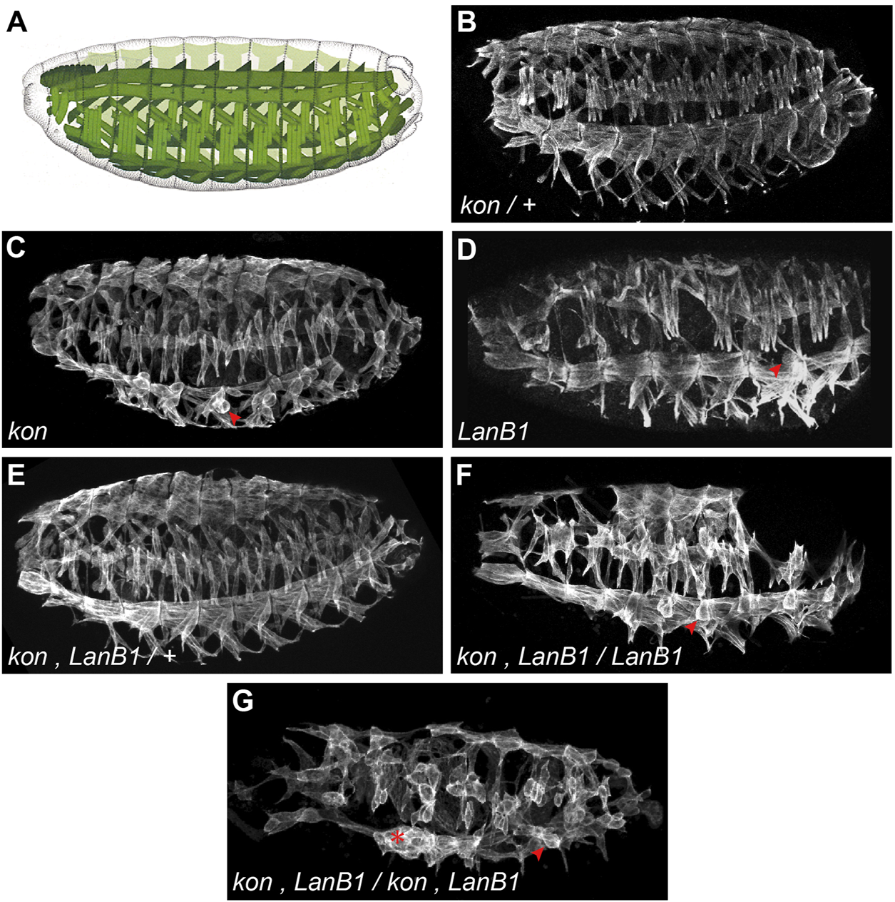 Despite the requirement of both LanB1 and Kon during muscle development, we propose they are likely acting in parallel. The strong genetic interaction observed suggests they are neither upstream/downstream of each other in the same pathway nor working together as ligand and receptor. In addition, we observed that LanB1 localization is not regulated by Kon. However, they still might be part of the same molecular complex, where loss of different components could affect its functionality. In fact, it has been shown that the Kon orthologue, NG2, can physically interact in vitro with laminin (Burg et al., 1996).
