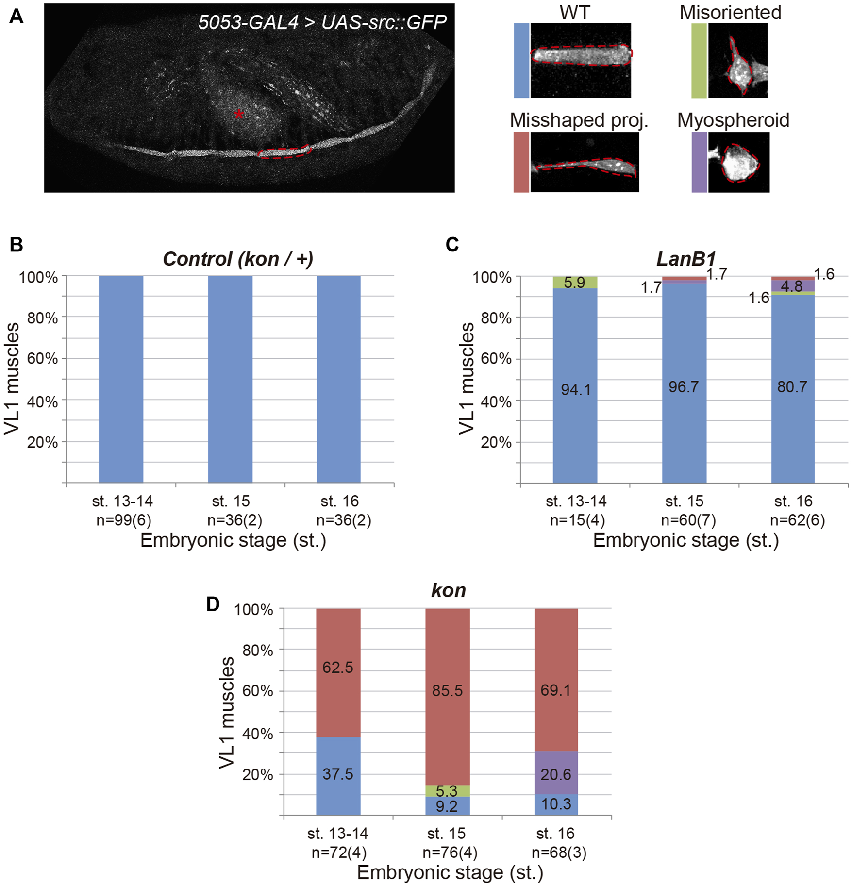 Development of ventral-longitudinal muscle 1 (VL1). (A) Left panel shows a representative example of the confocal projection in a stage 16 embryo. 5053-GAL4 expresses the plasma membrane marker src:GFP in the VL1 muscle of each segment (dotted line indicates one example) and the gut (asterisk). Right panels show representative examples of the different morphological phenotypes observed in VL1 muscle for the genotypes indicated. (B–D) Quantification of the proportion of VL1 muscles according to their morphology at different embryonic stages for the indicated genotypes. Bar colors indicate VL1 muscle phenotypes: WT, blue; Misoriented, green; Misshaped projection, red; Myospheroid, purple. Sample size indicates the total number of muscles over the number of embryos indicated between parentheses.