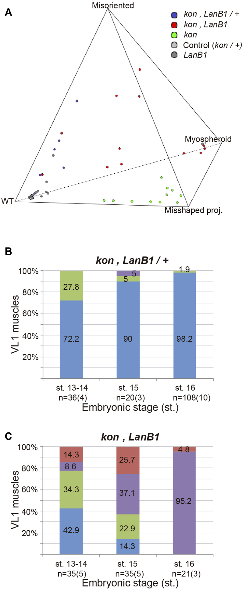 To better understand the specific role of LanB1 and kon and their interaction, we first analyzed, independently of the stage, VL1 muscle morphology in different dosages of mutant alleles for LanB1 and kon. The spatial distribution of the observed muscles with different phenotypes within a polyhedron showed that there is a statistically significant difference in their distribution among genotypes. Specifically, loss of one or two copies of LanB1 in a kon background caused the displacement of the kon phenotypes towards the misoriented muscle morphology, suggesting an interaction between LanB1 and kon in muscle migration and attachment formation. This statistical analysis (Figure 3A and Supplementary Movie) (see Material and Methods for more details) allowed us to carry out the specific pairwise comparisons of the phenotypes among genotypes in different stages.