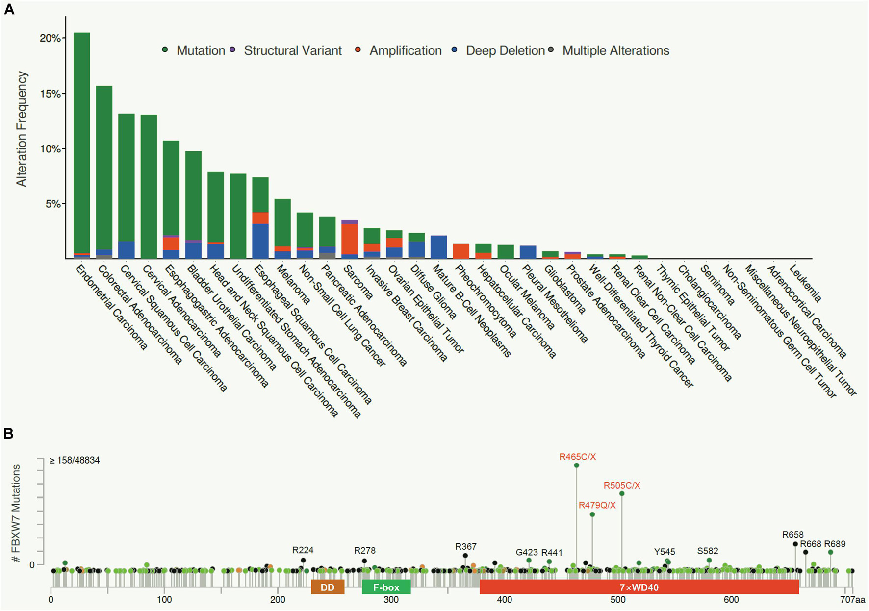 Figure 2. FBXW7 mutation frequency in human cancers and their distributions. (A) FBXW7 mutation frequency in different types of human cancer, analyzed from cBioPortal Database (https://www.cbioportal.org/). (B) Distribution of FBXW7 mutations in the FBXW7 encoding region. Mutations detected in more than 15 cancer samples are annotated, and three most frequent mutation hotspots, R465, R479, and R505 are highlighted in red.